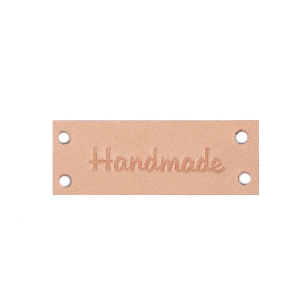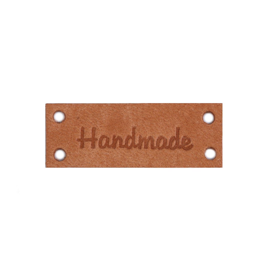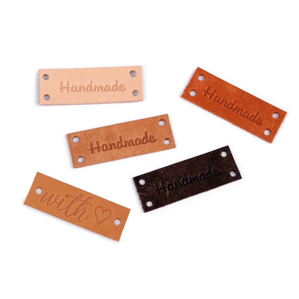 Kožená cedulka je jednostranná, na bocích má otvory k přišití. Zdobí ji vyražený nápis Hand made.