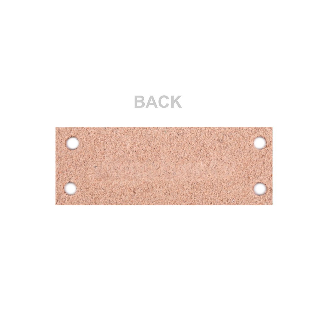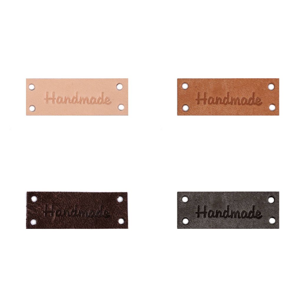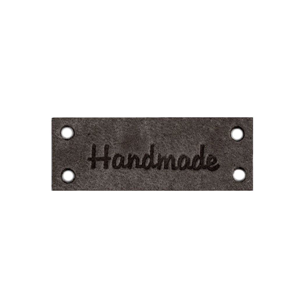 Kožená cedulka je jednostranná, na bocích má otvory k přišití. Zdobí ji vyražený nápis Hand made.