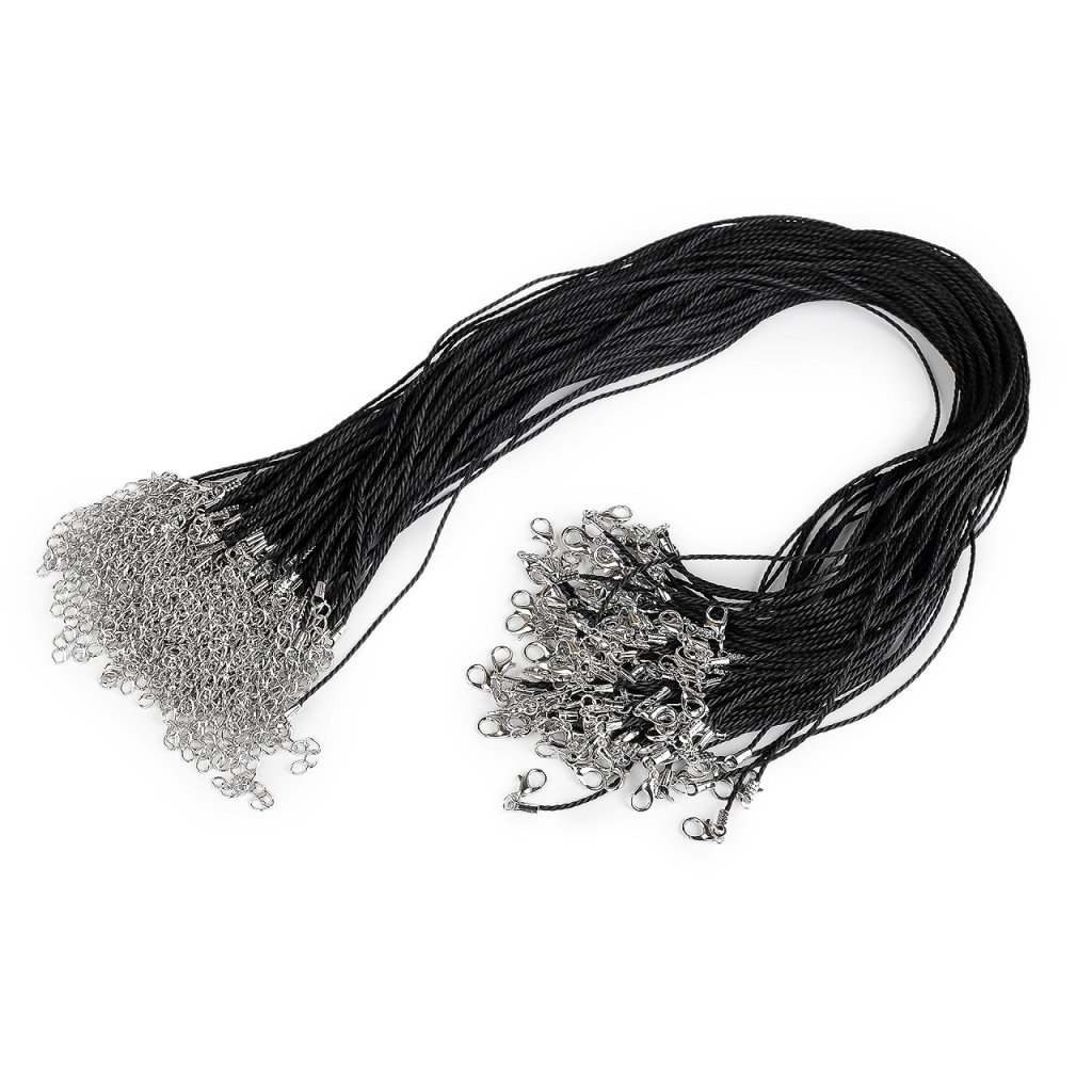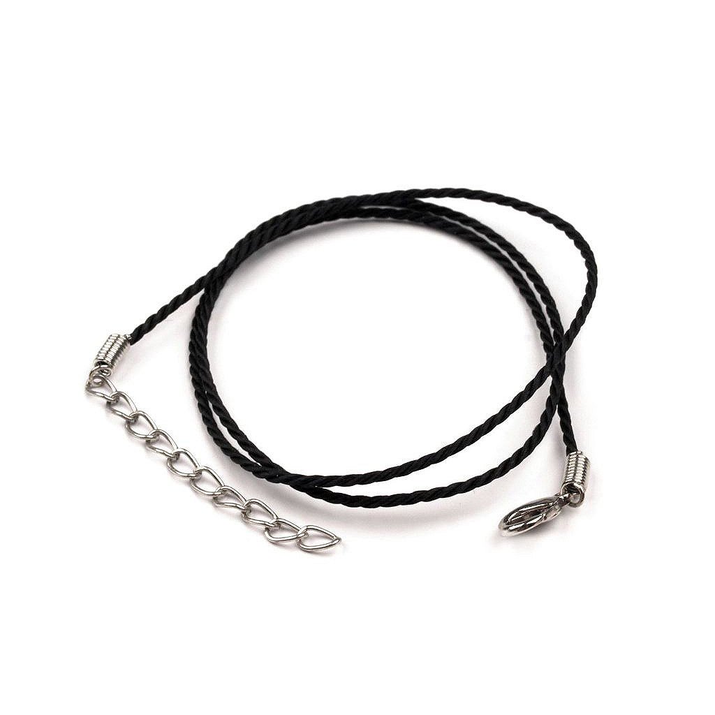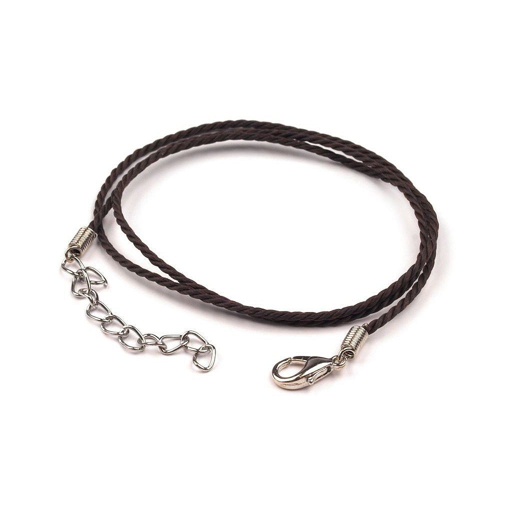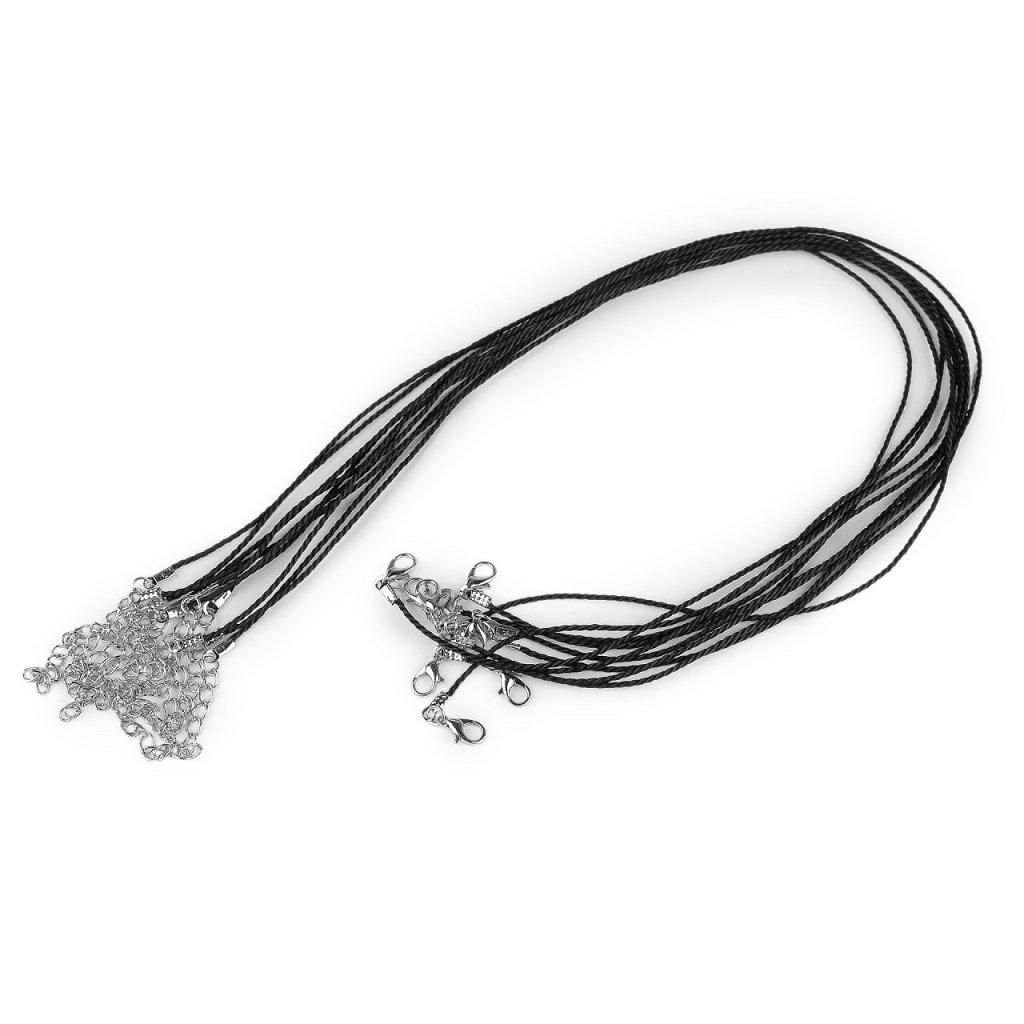 Módní šňůrka k zavěšení přívěsků. Délka 45cm+5cm adjustační řetízek. Karabinka 5x10mm. Šňůra Ø1 mm. V případě, že přívěsek nebude možno díky koncovce navléci, tak lze kleštěmi pružinovou koncovku rozevřít, navléci přívěsek a opět koncovku uzavřít.