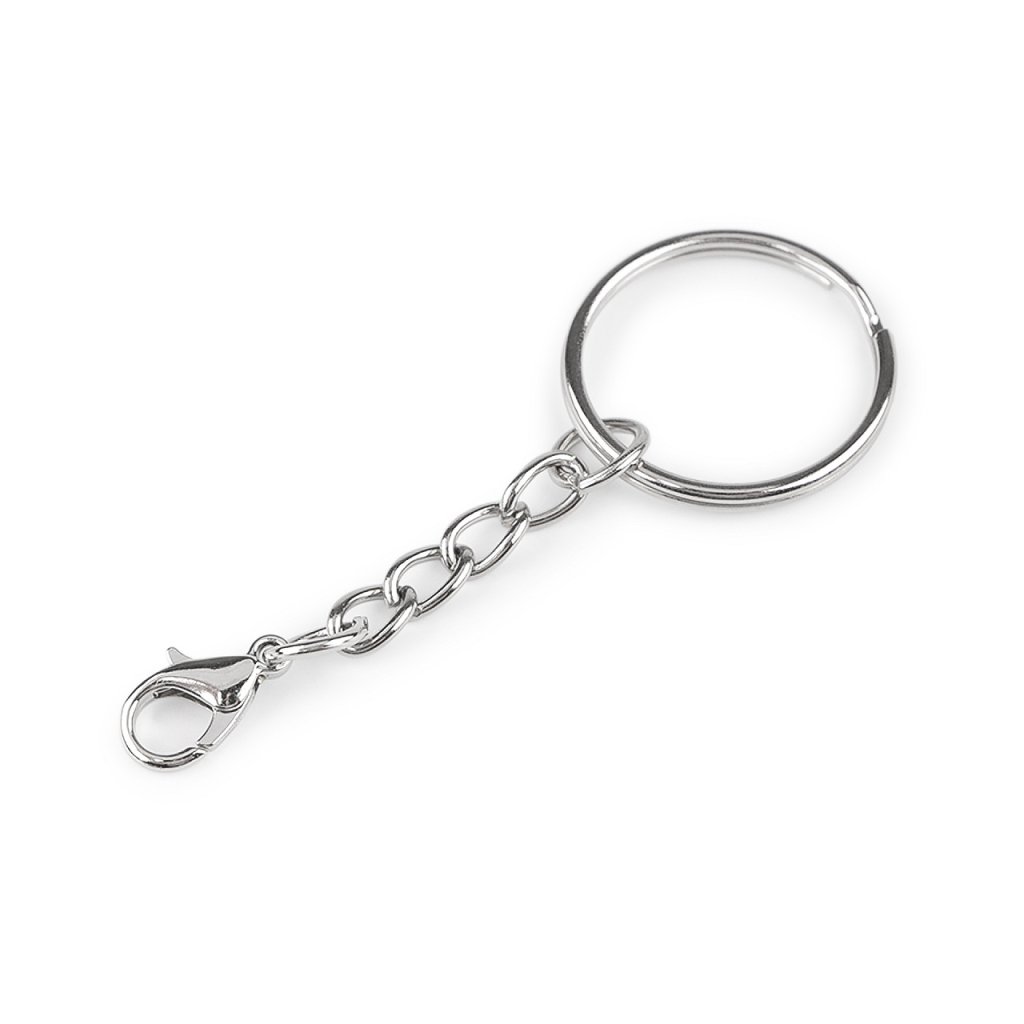 Kroužek s řetízkem doplňuje malá karabinka na konci řetízku. Využijete ho na klíče, přívěsky na batohy, kabelky apod.