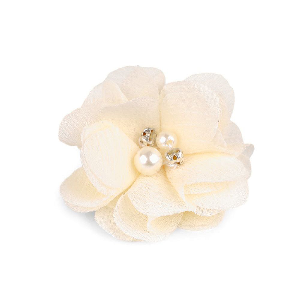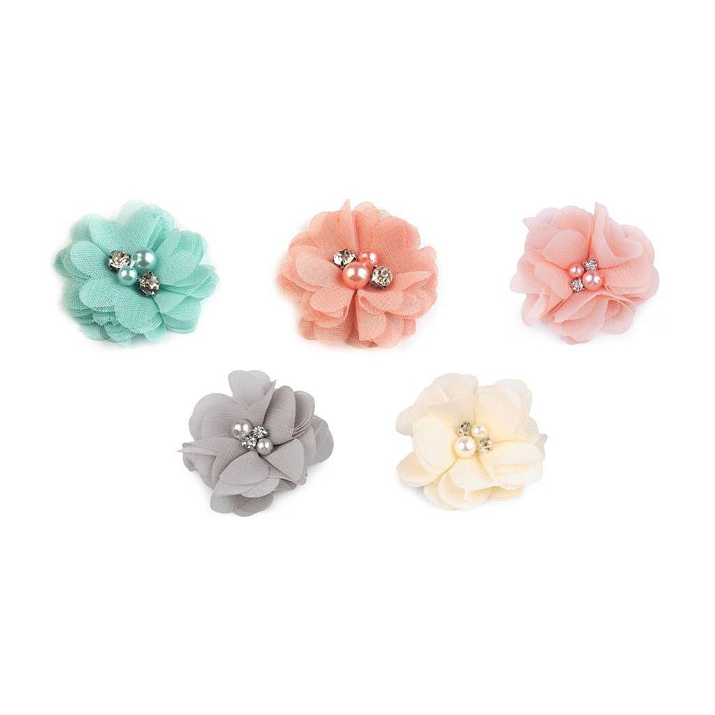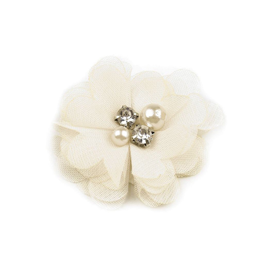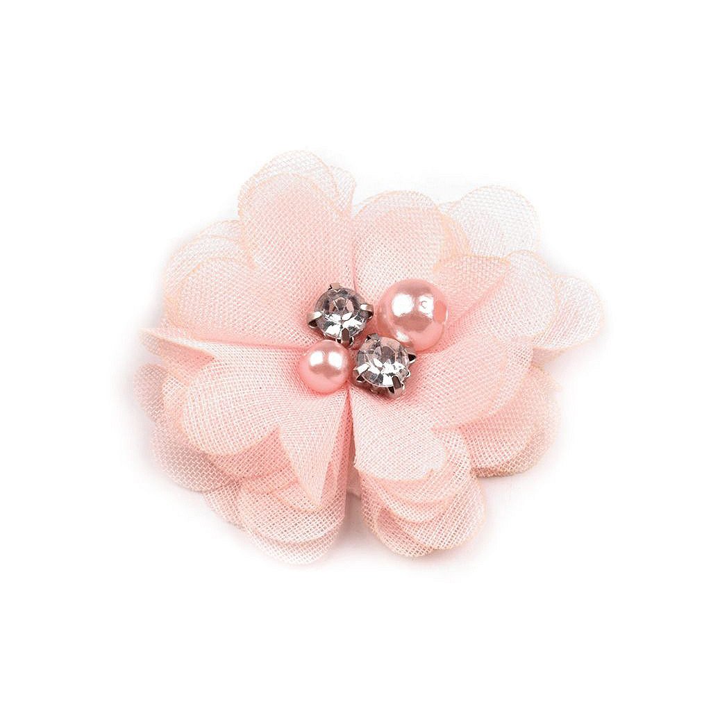 Textilní květ působí jemně a romanticky. V jeho středu jsou našité plastové korálky a broušené kamínky, které se efektně třpytí.