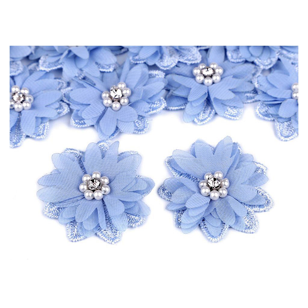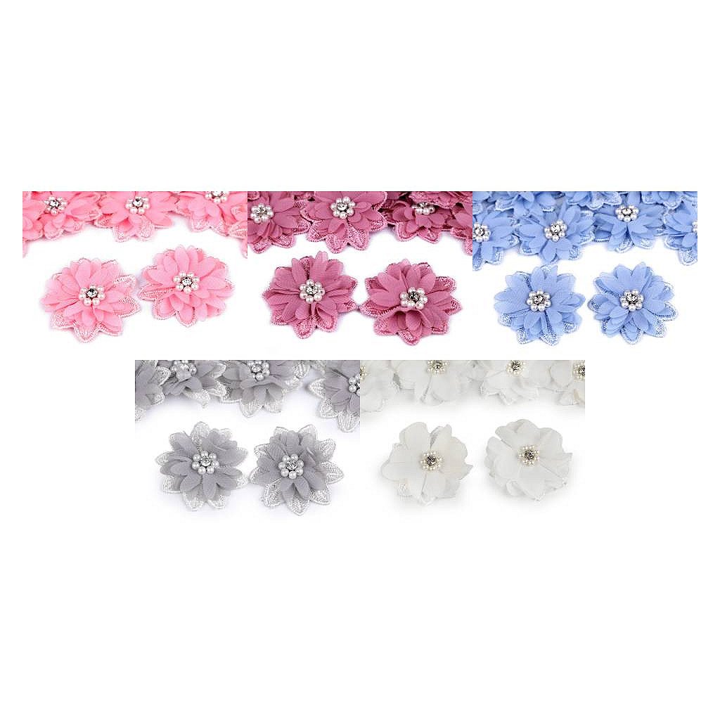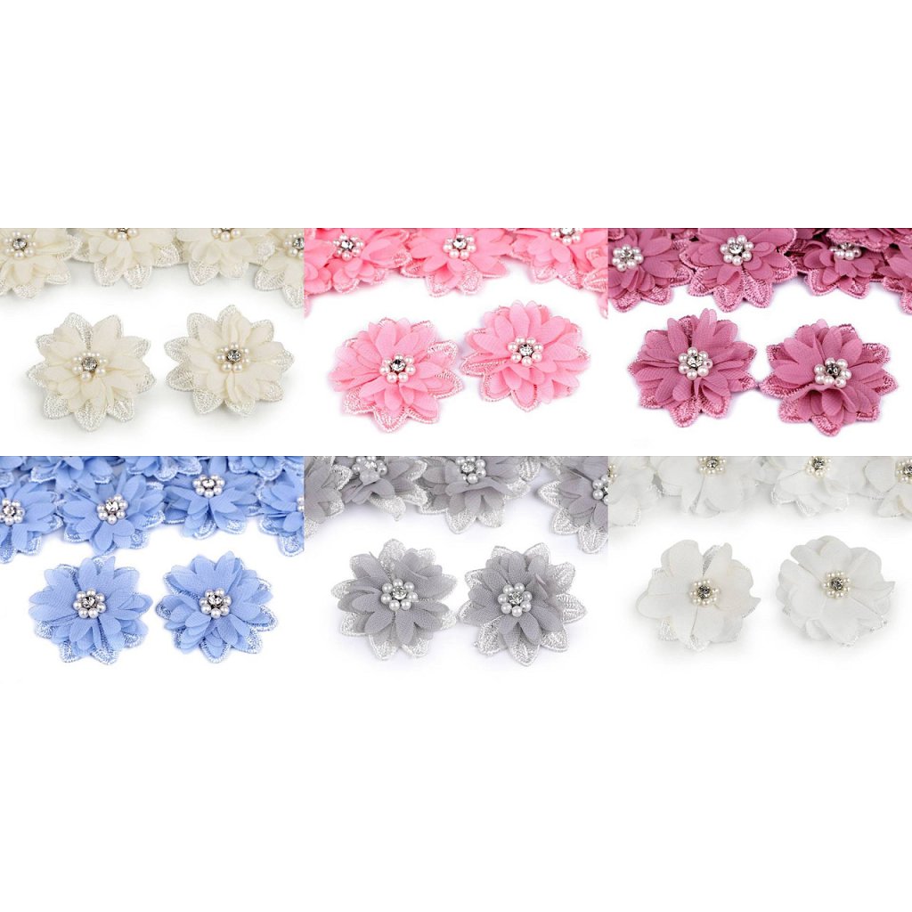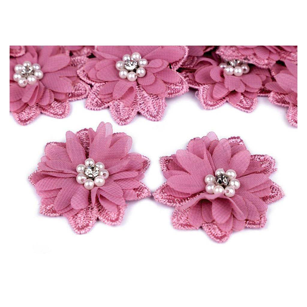 Něžný textilní květ je zhotovený z krajkového základu a dalších vrstev, které jsou šifónové. Jeho střed zdobí korálky a třpytivý kamínek. Květy můžete našít či nalepit na svetříky, halenky, šaty, kabátky, psaníčka, tašky nebo klobouky a čepice. Je vhodný i na tvorbu broží a různých vlasových ozdob.