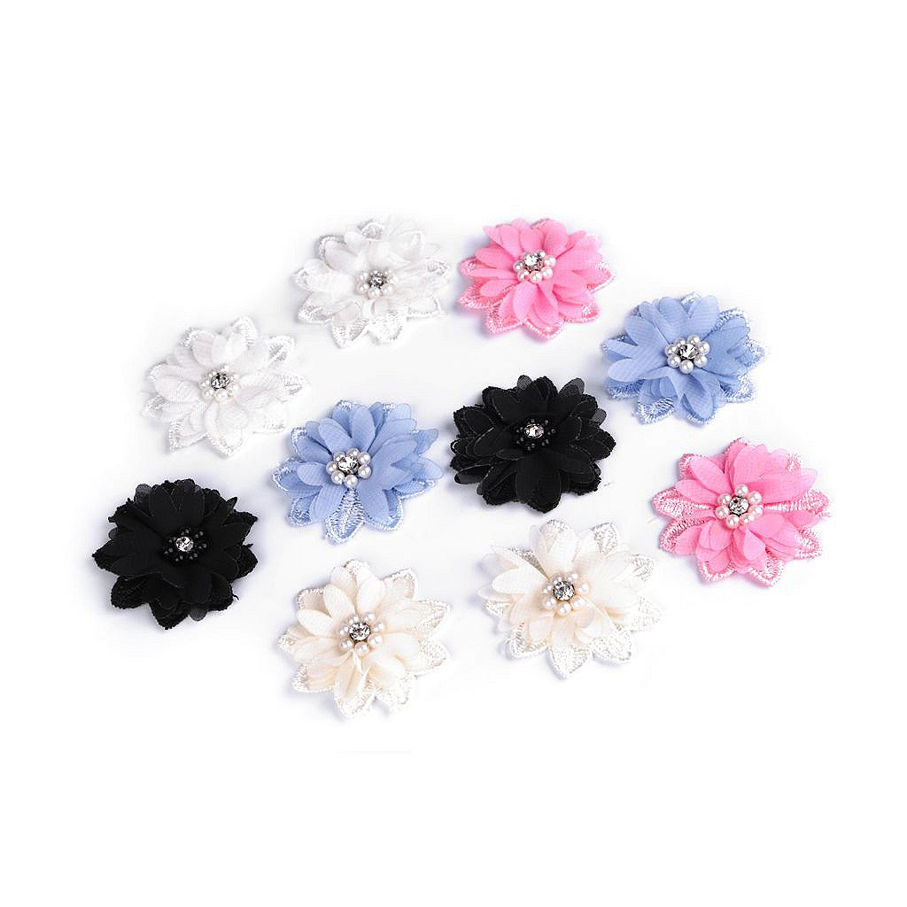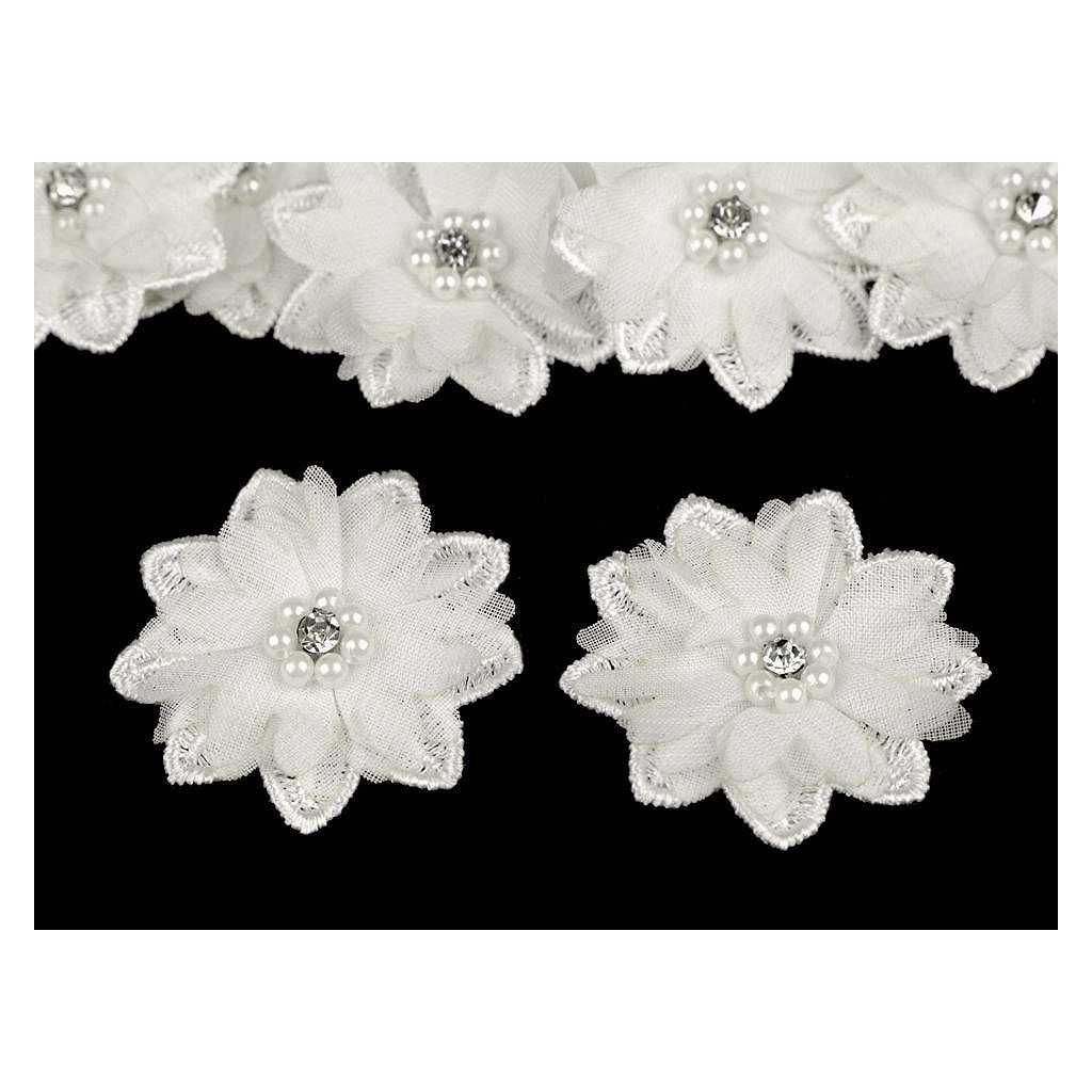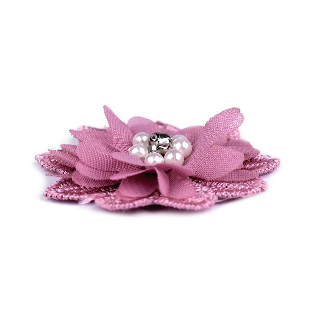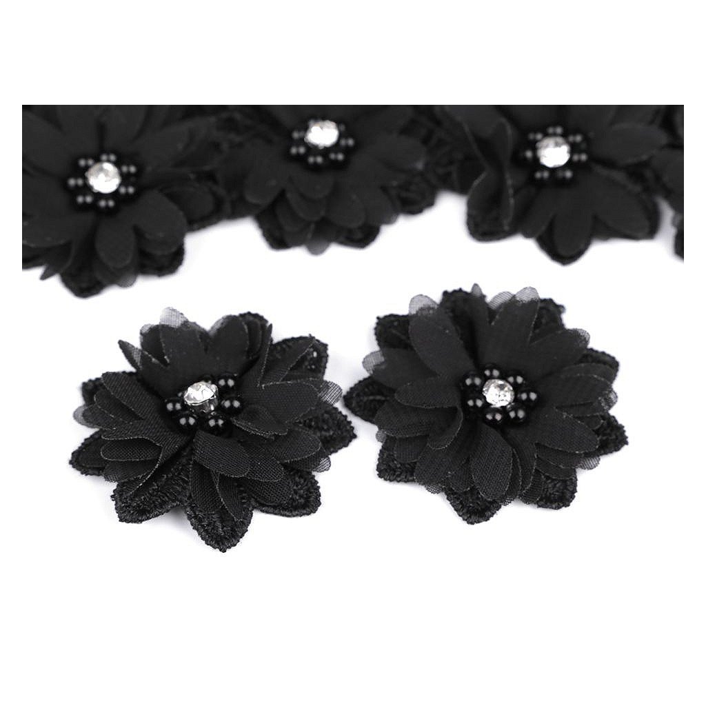 Něžný textilní květ je zhotovený z krajkového základu a dalších vrstev, které jsou šifónové. Jeho střed zdobí korálky a třpytivý kamínek. Květy můžete našít či nalepit na svetříky, halenky, šaty, kabátky, psaníčka, tašky nebo klobouky a čepice. Je vhodný i na tvorbu broží a různých vlasových ozdob.