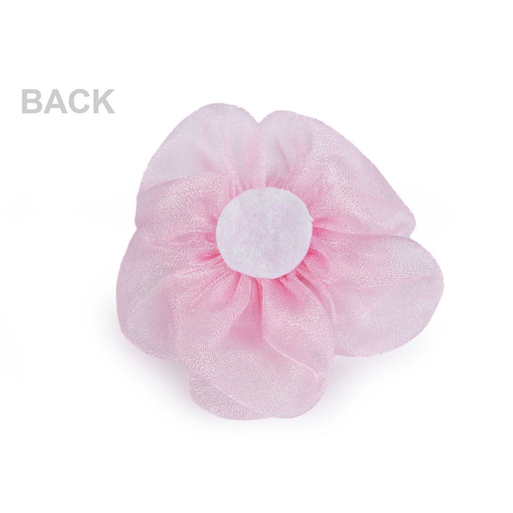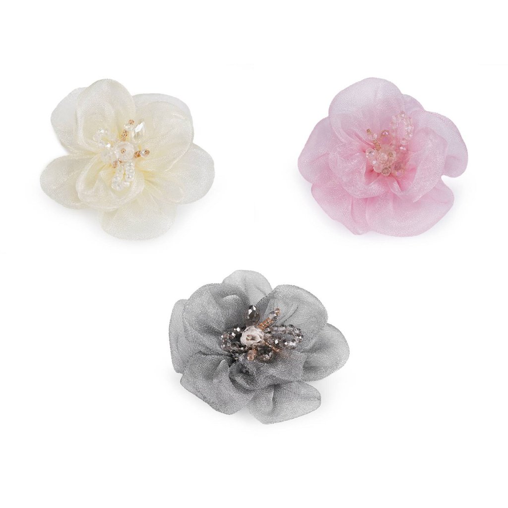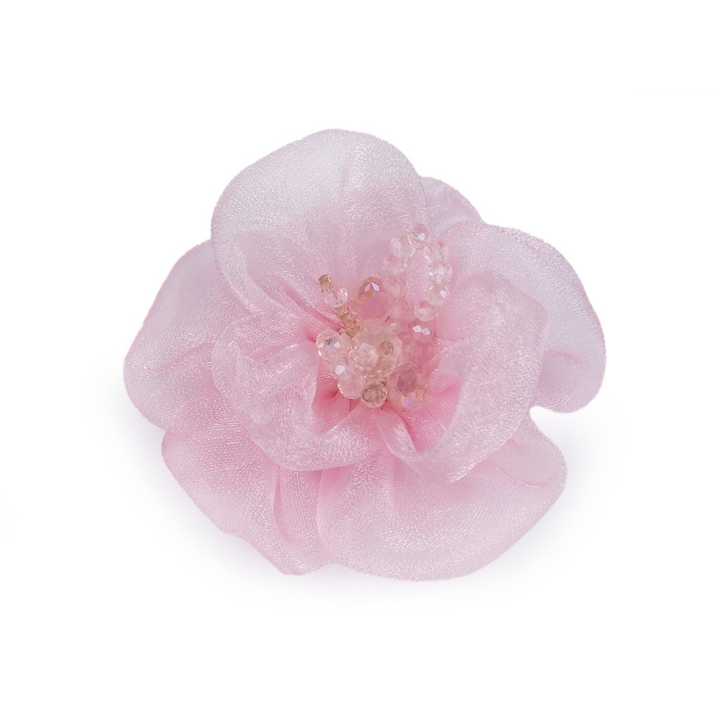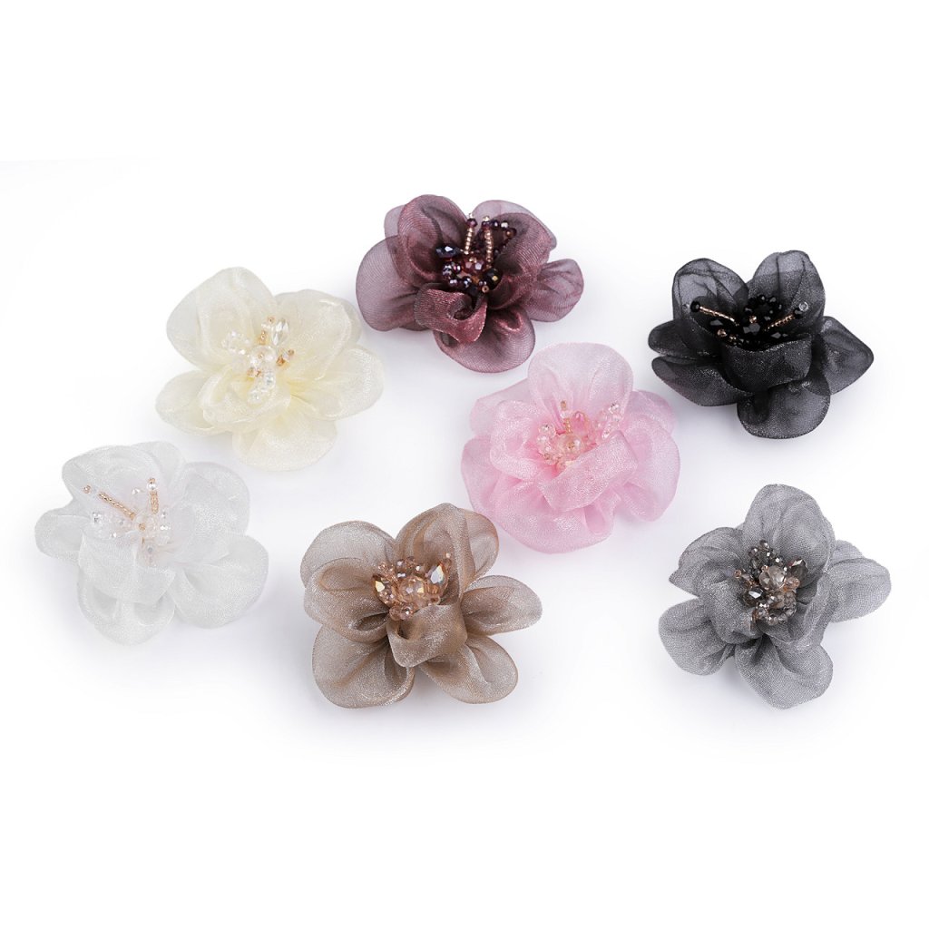 Romantický textilní květ z organzy s jemným třpytem je ve středu dozdobený propracovanými pestíky z broušených korálků. Díky nim se nádherně leskne. Květ má široké možnosti využití. Má bohaté okvětní plátky, působí nadýchaným vzhledem. Ve spodní části má textilní kolečko, pomocí kterého jej pohodlně kamkoliv upevníte. Dá se našít i nalepit.