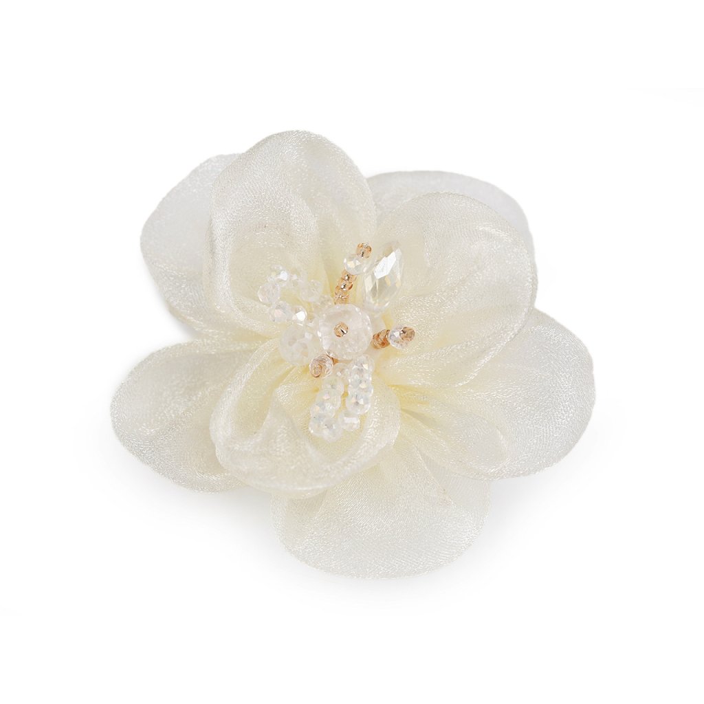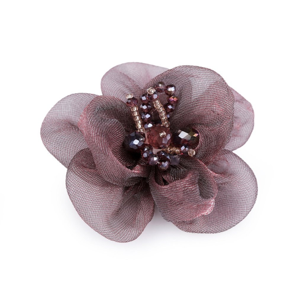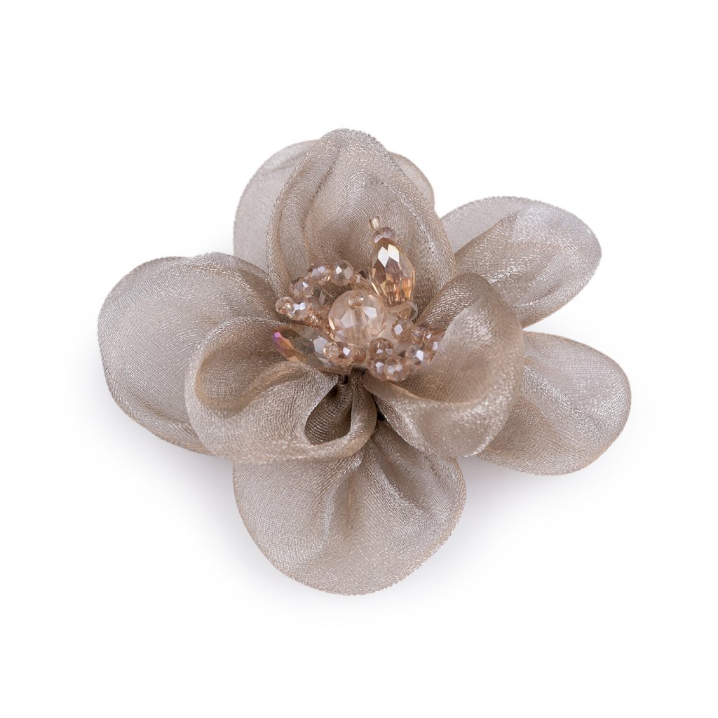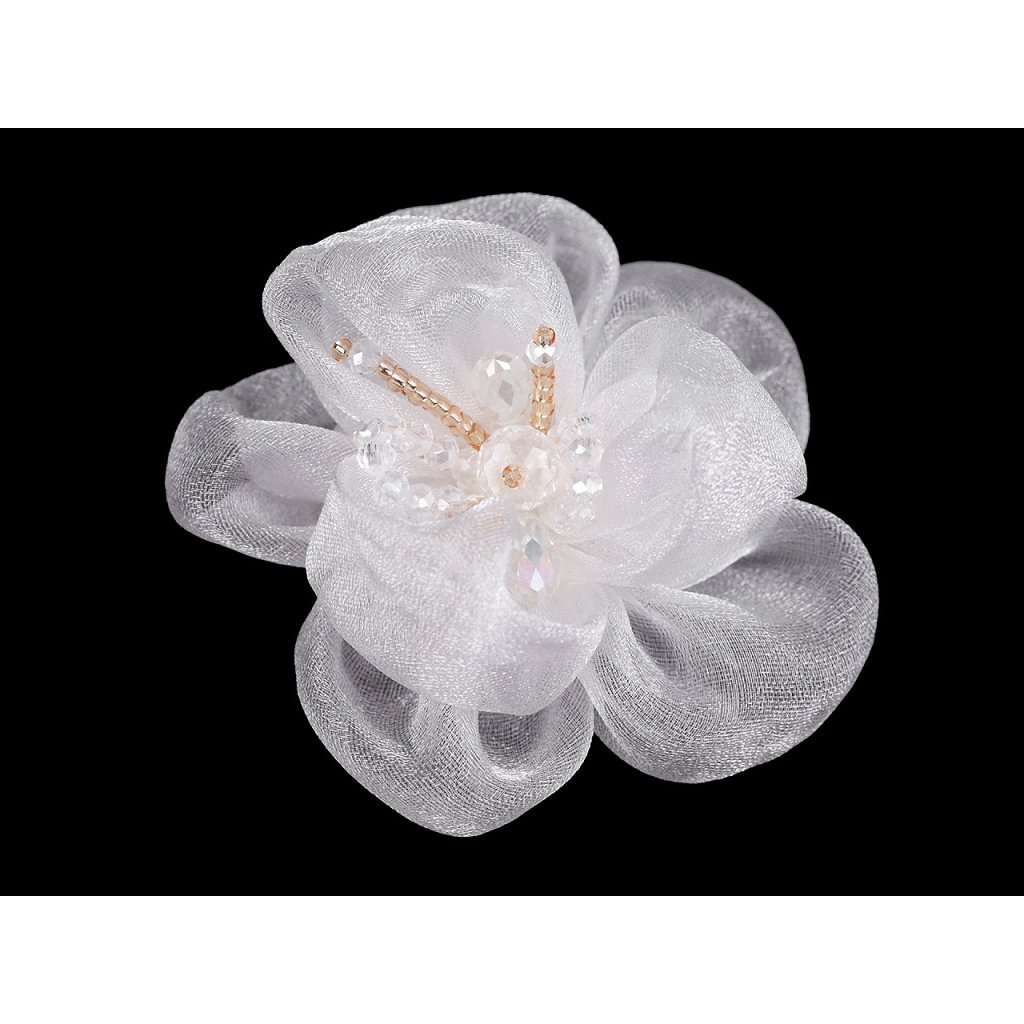 Romantický textilní květ z organzy s jemným třpytem je ve středu dozdobený propracovanými pestíky z broušených korálků. Díky nim se nádherně leskne. Květ má široké možnosti využití. Má bohaté okvětní plátky, působí nadýchaným vzhledem. Ve spodní části má textilní kolečko, pomocí kterého jej pohodlně kamkoliv upevníte. Dá se našít i nalepit.