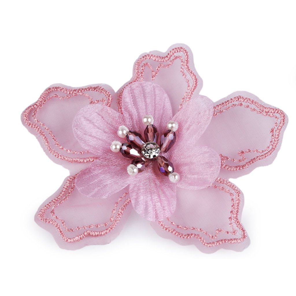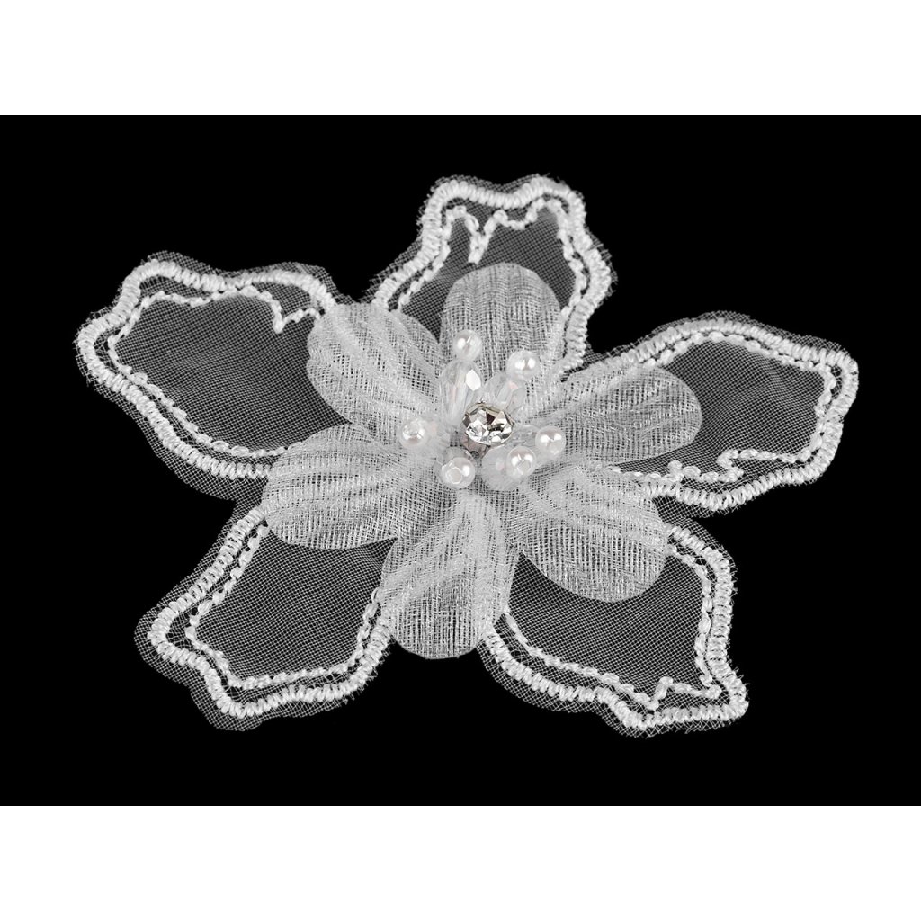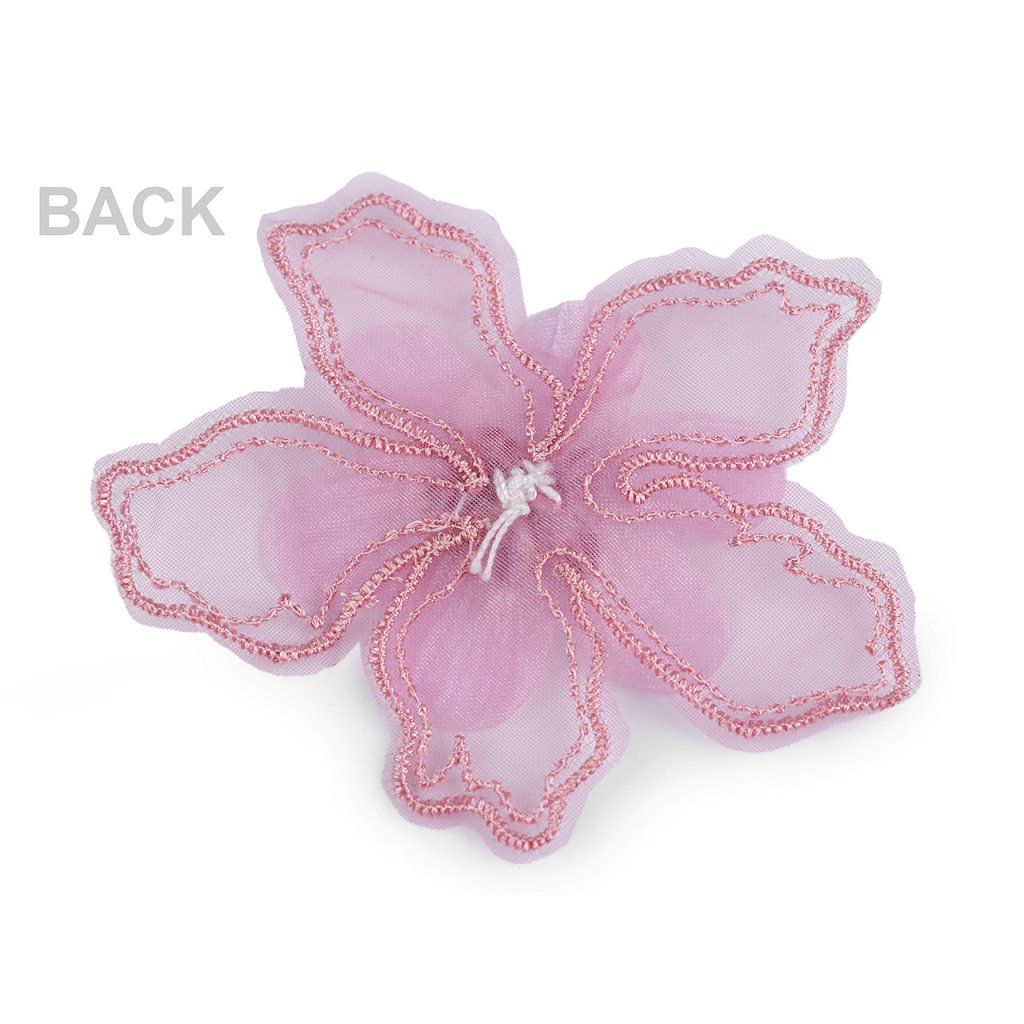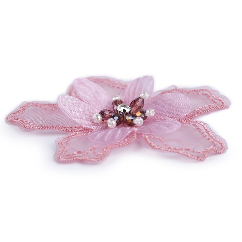 Zdobný květ je složený ze 2 vrstev: spodní část květu je monofilová se zesílenými vyšívanými okraji a působí velmi romanticky. Druhou vrstvu tvoří jednoduchý květ z organzy. Střed květu zdobí našité broušené korálky, perličky a broušený kamínek.