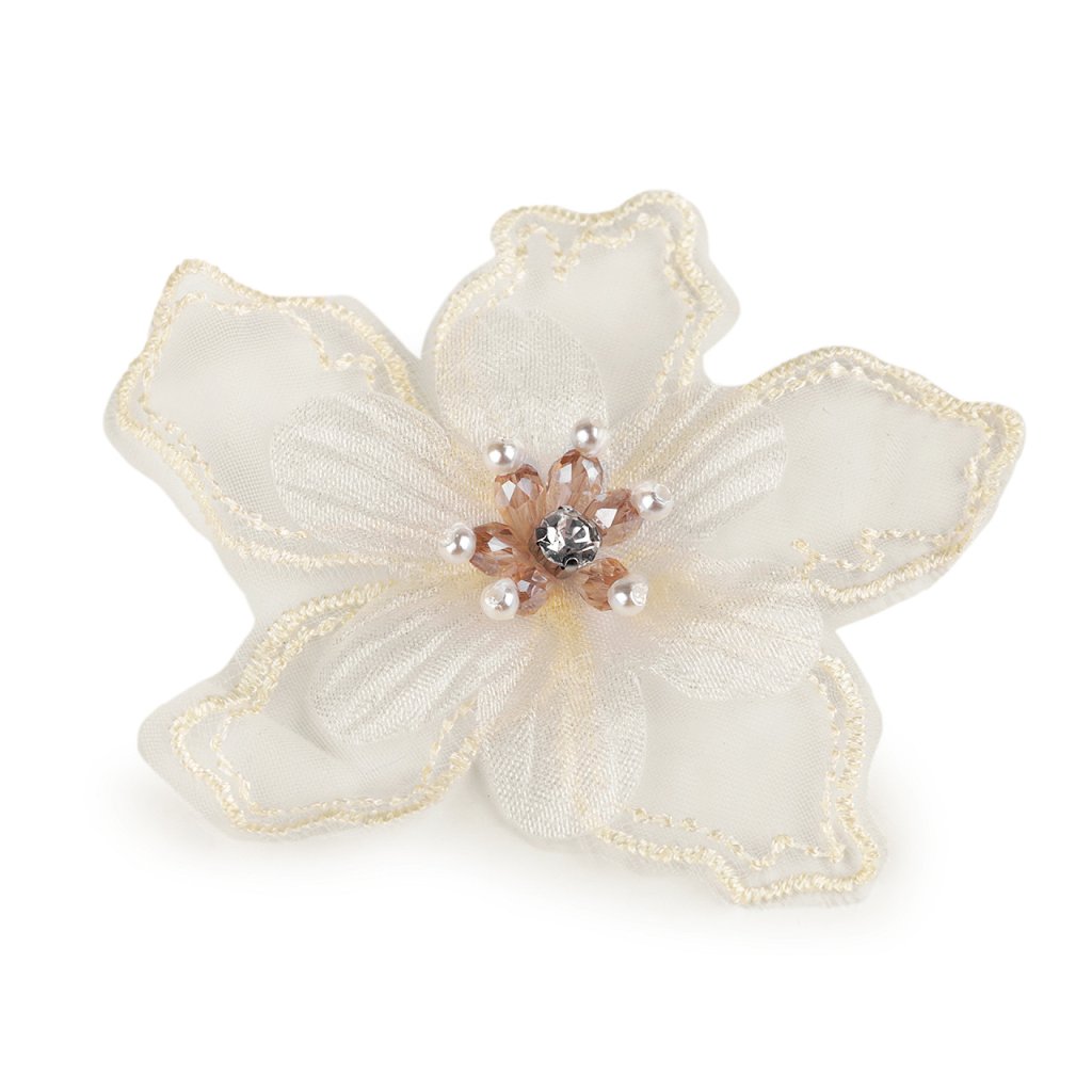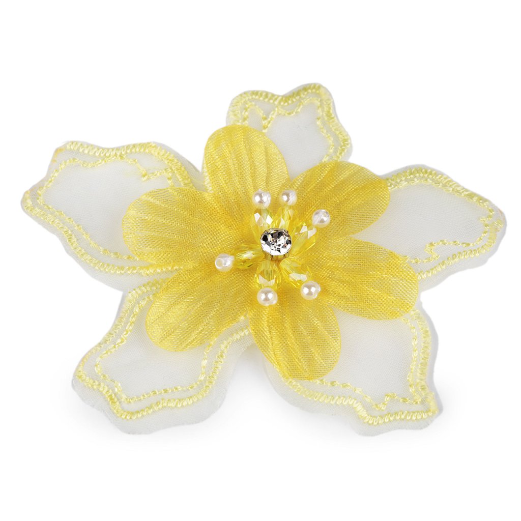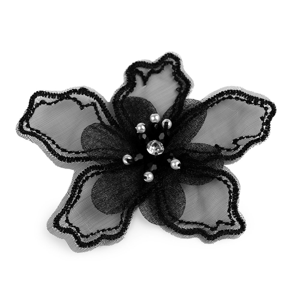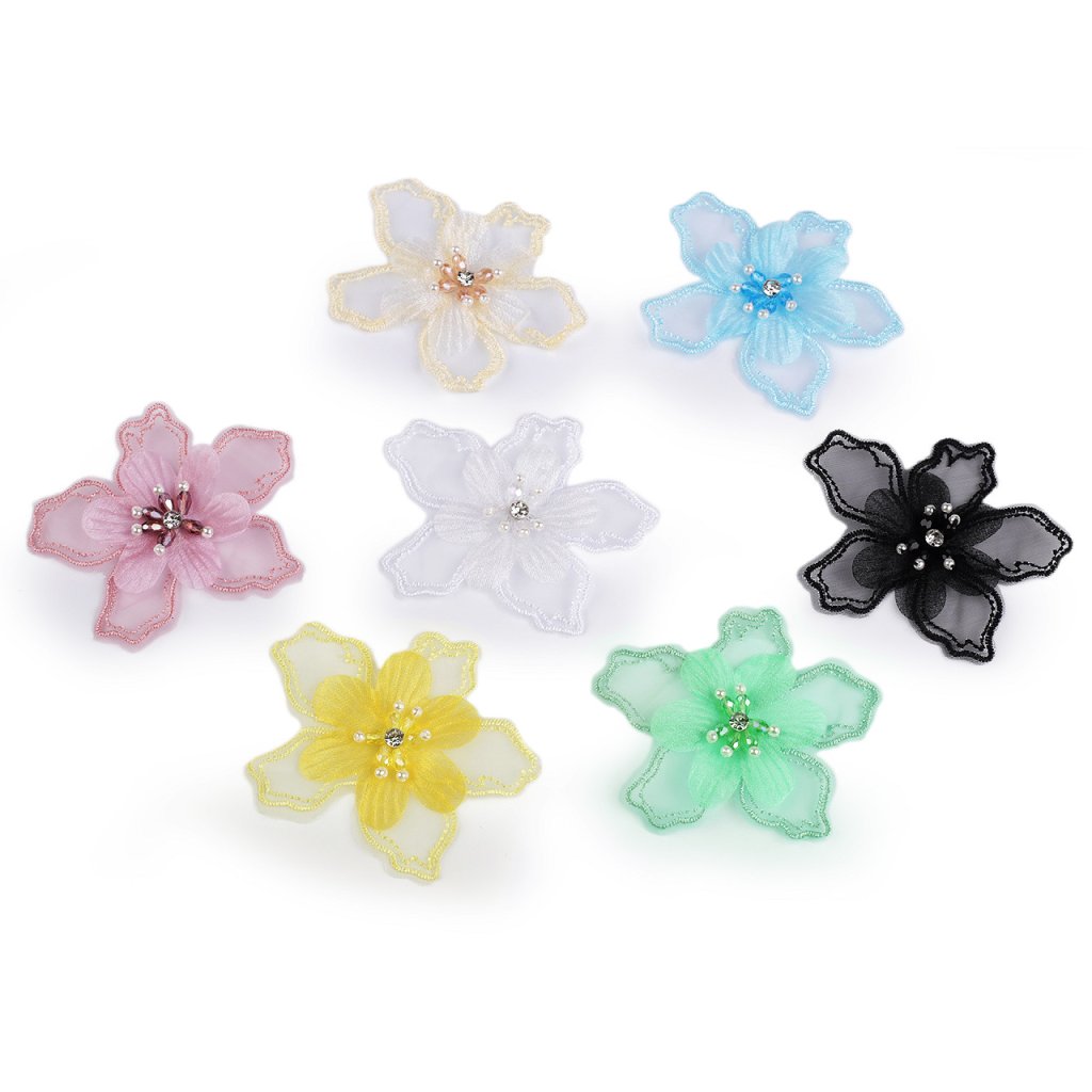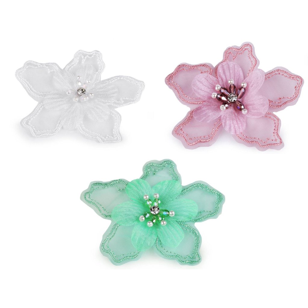 Zdobný květ je složený ze 2 vrstev: spodní část květu je monofilová se zesílenými vyšívanými okraji a působí velmi romanticky. Druhou vrstvu tvoří jednoduchý květ z organzy. Střed květu zdobí našité broušené korálky, perličky a broušený kamínek.