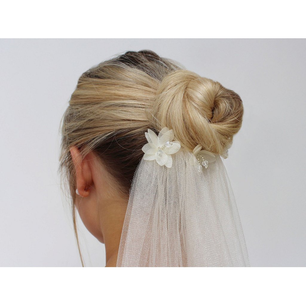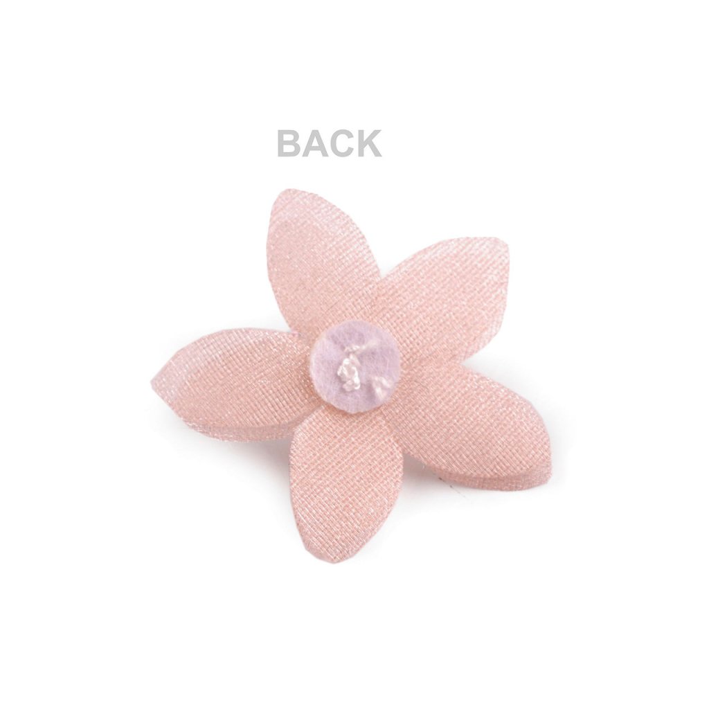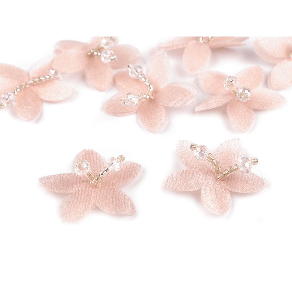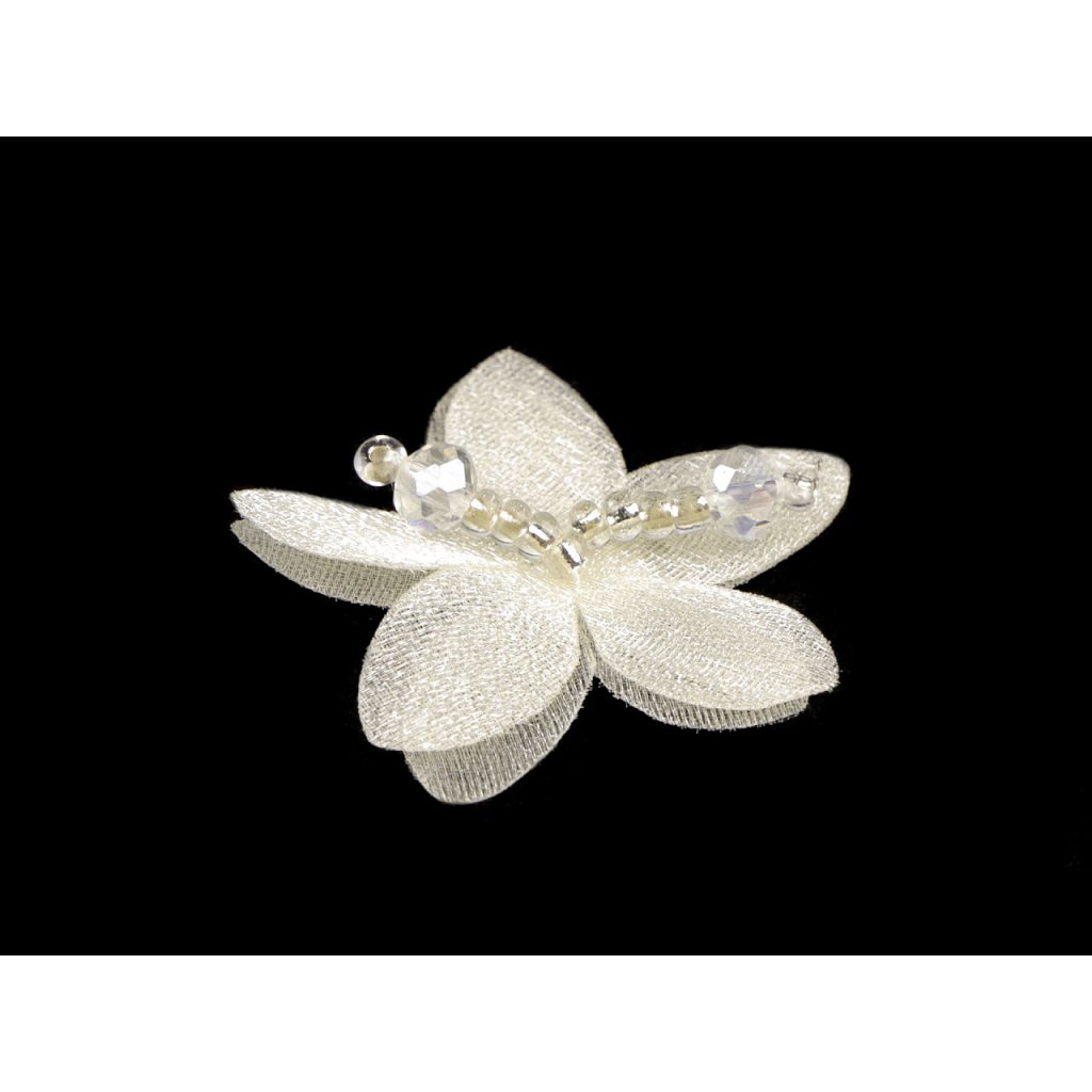 Elegantní květ se zdobeným středem je složený ze 2 vrstev tužšího monofilu s jemným perleťovým leskem. Střed je ručně dozdobený pestíky z broušených korálků a rokajlu, působí velice romanticky. Pestík ve středu květu dodává třpytivý efekt a zajišťuje bohatý a výrazný vzhled.