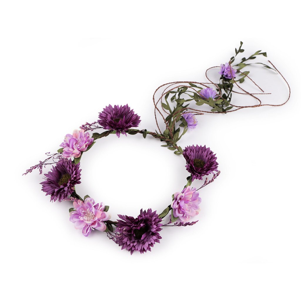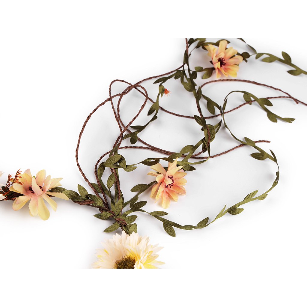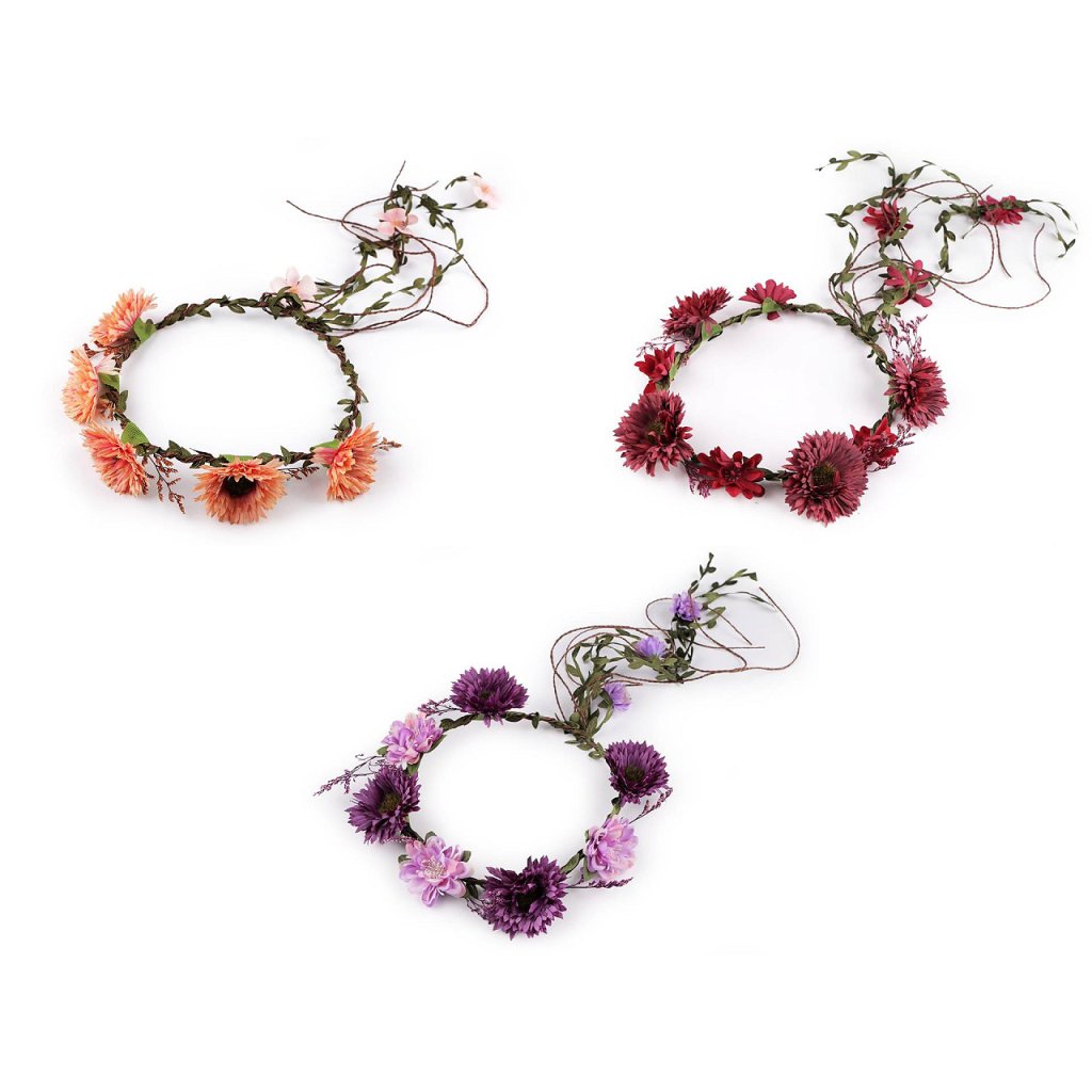 Můžete jej nosit jako ozdobu vlasů nebo použít k dekoračním účelům. Květy vypadají jako živé. Jsou připevněné k drátěné kostře, která je obalená papírem a ovinutá prýmkem s lístečky. Díky drátěnému základu můžete věneček tvarovat, velice příjemně se nosí.
