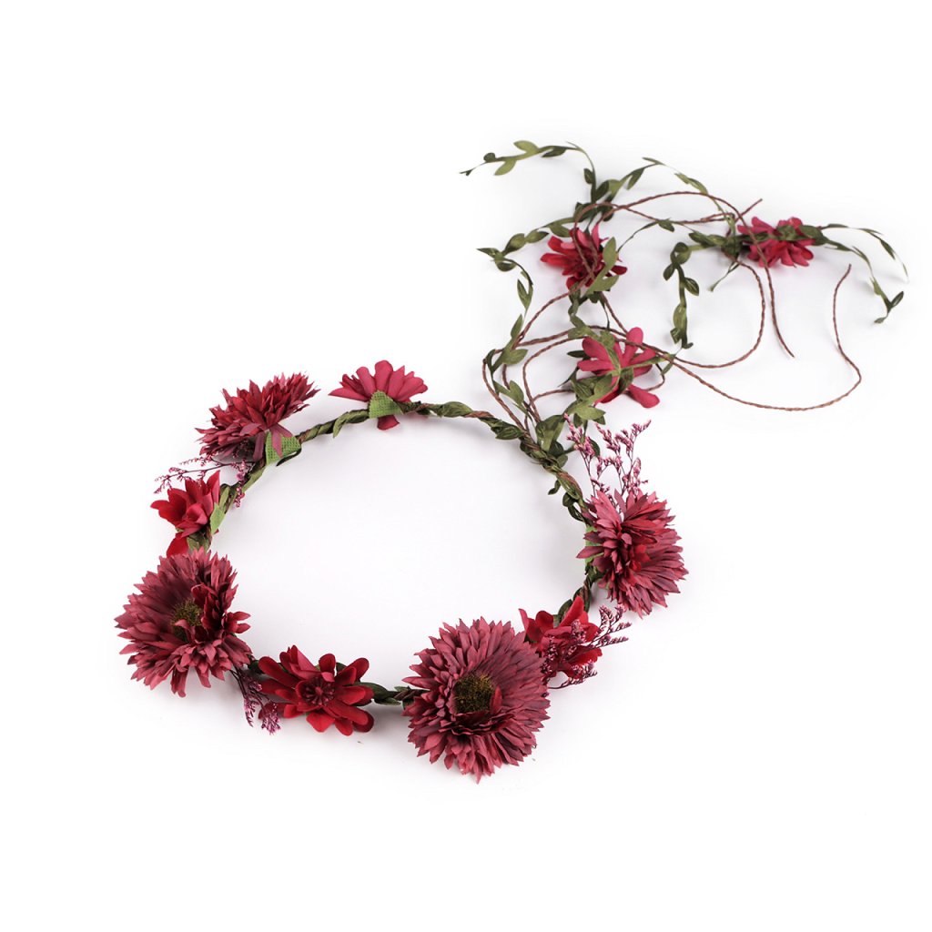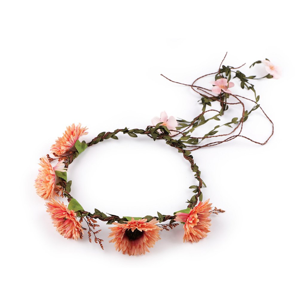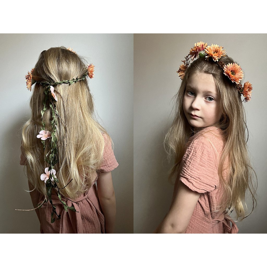 Můžete jej nosit jako ozdobu vlasů nebo použít k dekoračním účelům. Květy vypadají jako živé. Jsou připevněné k drátěné kostře, která je obalená papírem a ovinutá prýmkem s lístečky. Díky drátěnému základu můžete věneček tvarovat, velice příjemně se nosí.