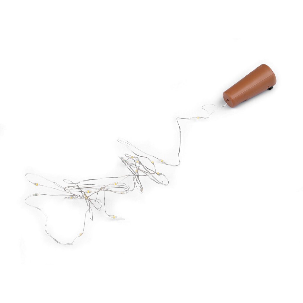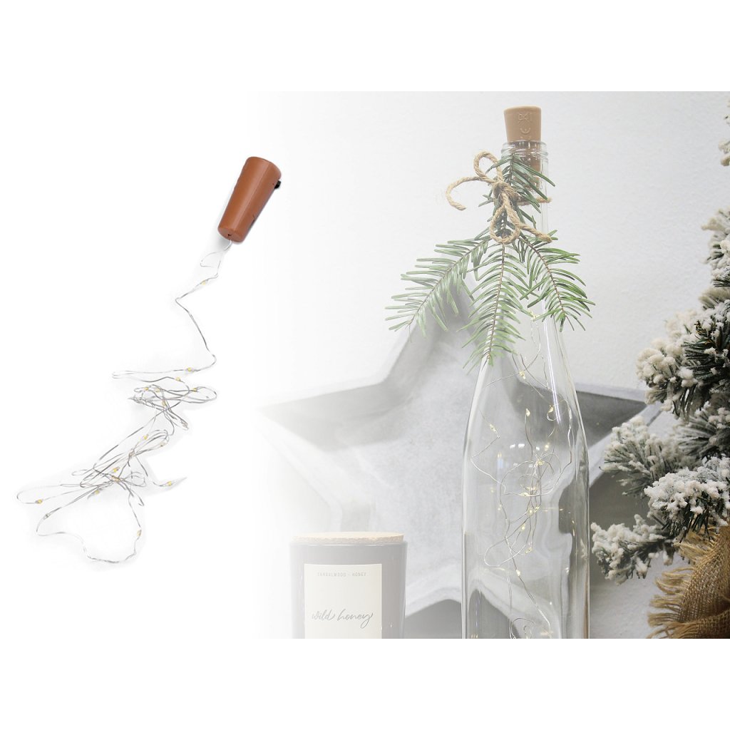 LED osvětlení v podobě špuntu využijete na jakékoliv prázdné skleněné láhve (od vína, piva, lihovin apod.) Najdete na něm 20 LED diod. Díky drátu ho můžete i dobře tvarovat. Dekorace svítí studeným světlem, nebliká. Špunt je vhodný k celoročnímu použití.