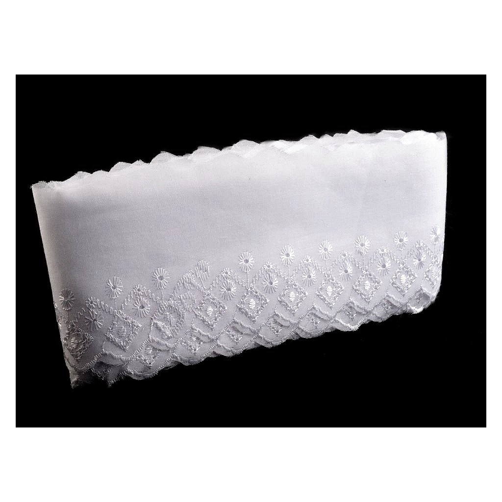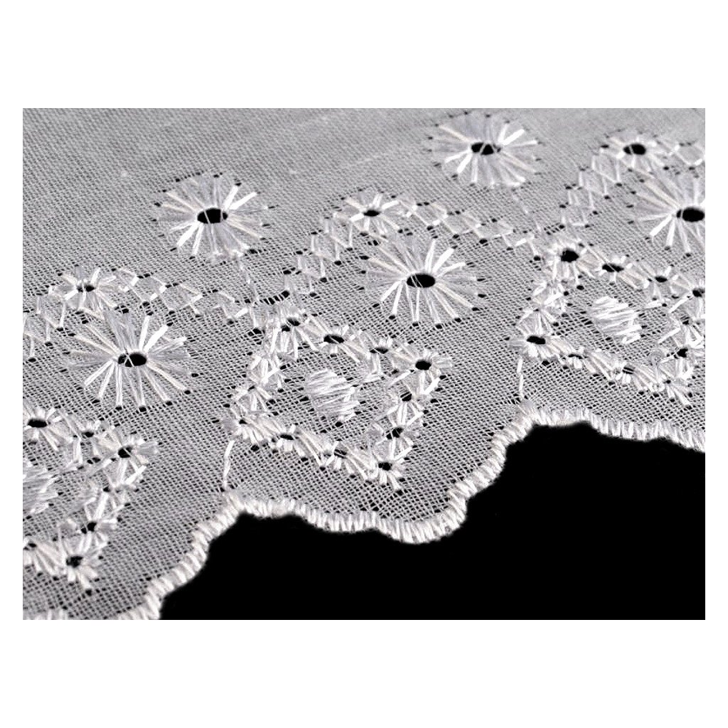 Madeiru zdobí designový motiv s lesklou dírkovou výšivkou. Je vhodná na zdobení oděvů i bytového textilu, například polštářů, povlečení, ubrusů, záclonek apod. Často se používá i jako ozdoba dětských zavinovaček.