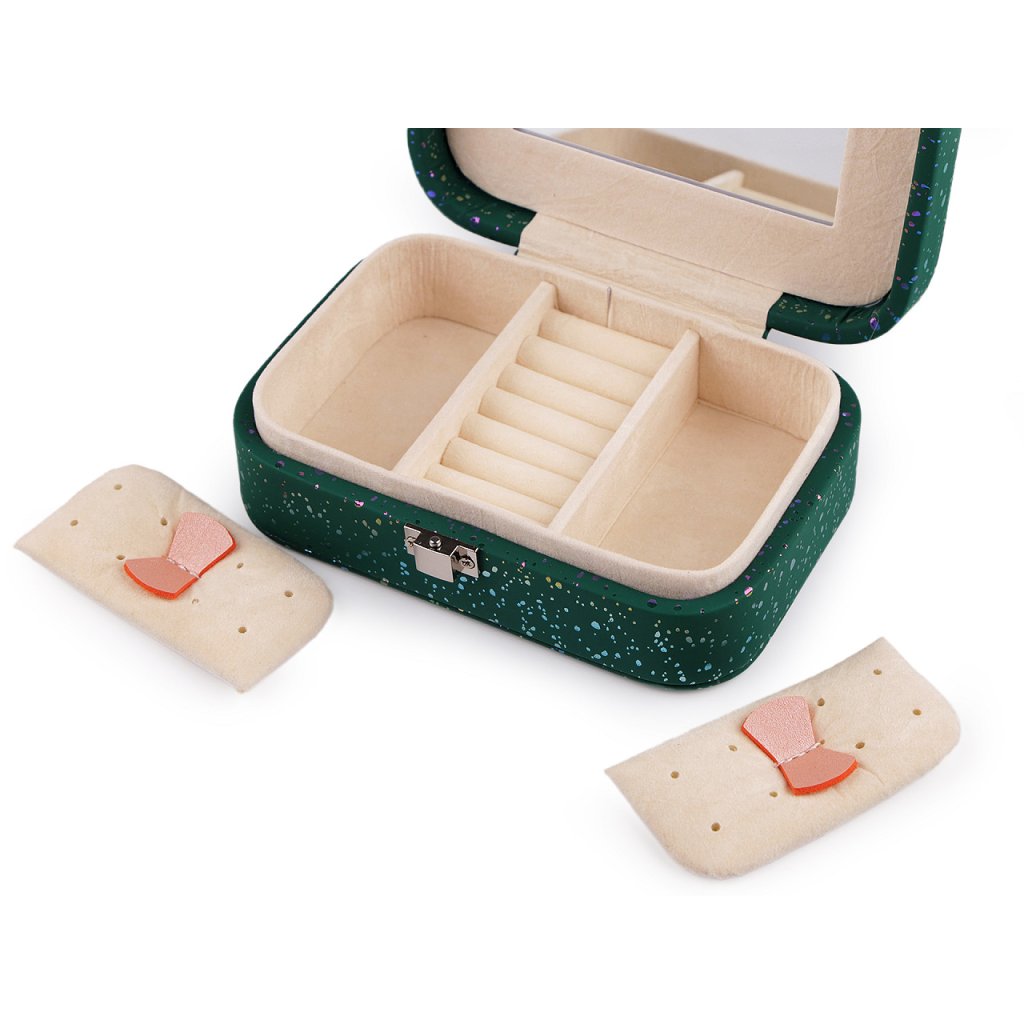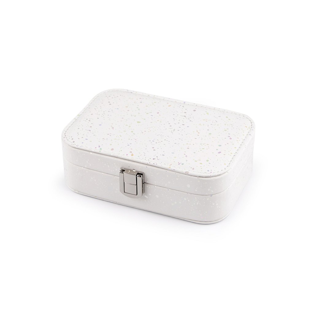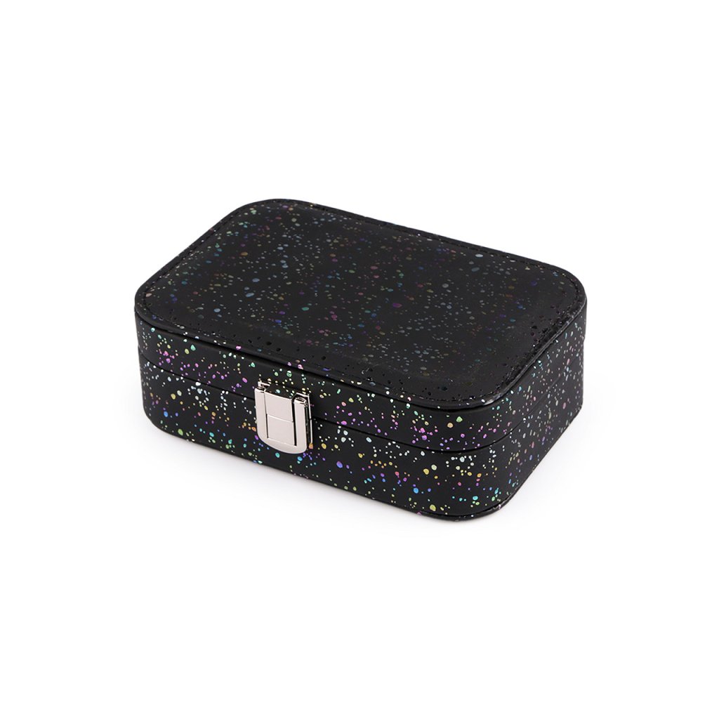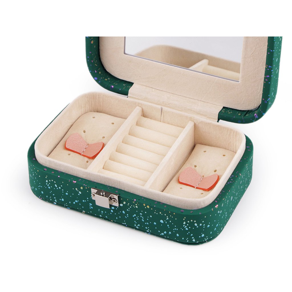 Malá šperkovnice má povrch posetý drobným metalickým potiskem, který se duhově leskne. Uzavírá se na kovové zapínání, spolehlivě ochrání šperky před nepříznivými vlivy okolí jako je světlo nebo vlhkost. Uvnitř šperkovnice jsou 2 přihrádky s polštářky na náušnice, oddíl na prsteny a zrcátko. Šperkovnice má velice kvalitní a precizní provedení.