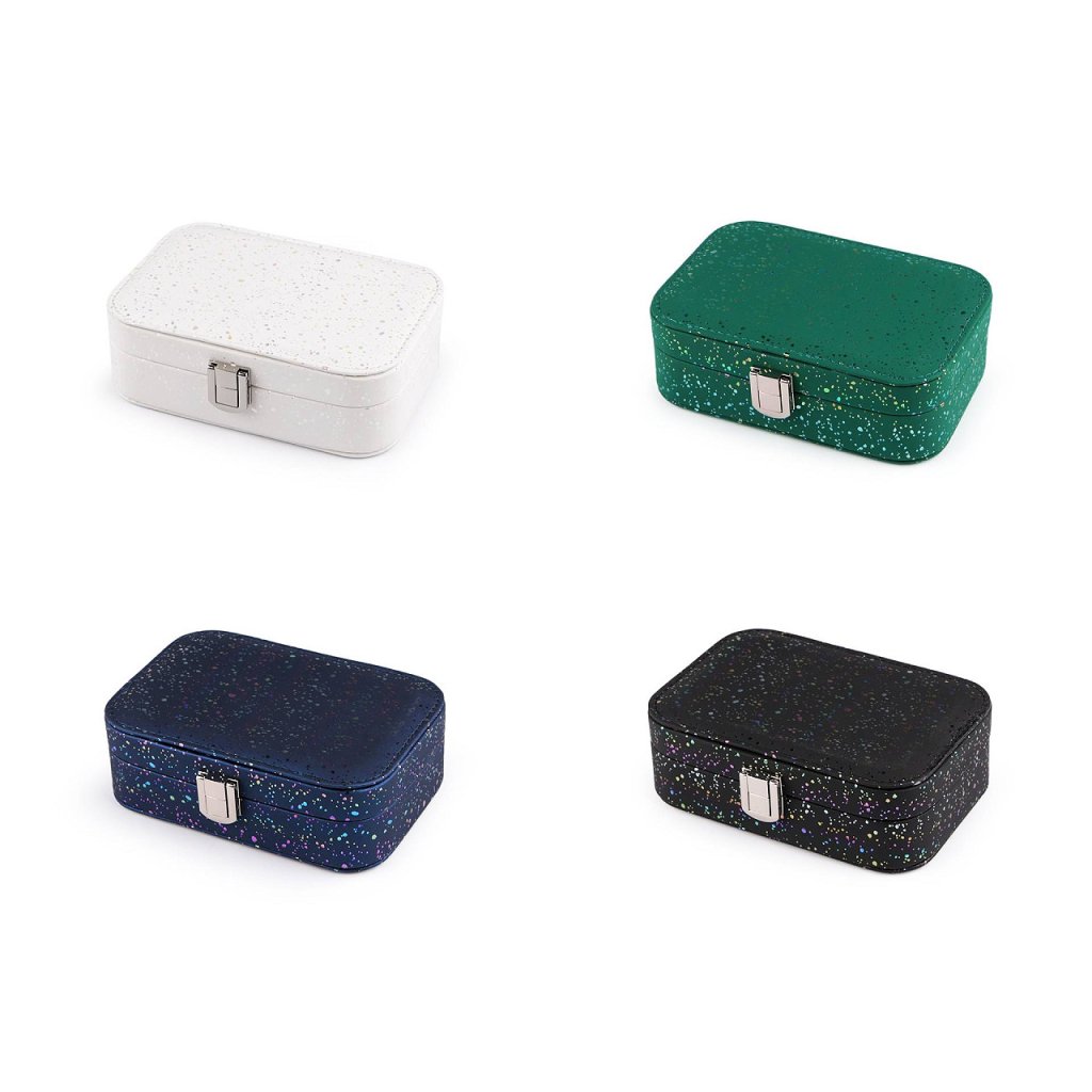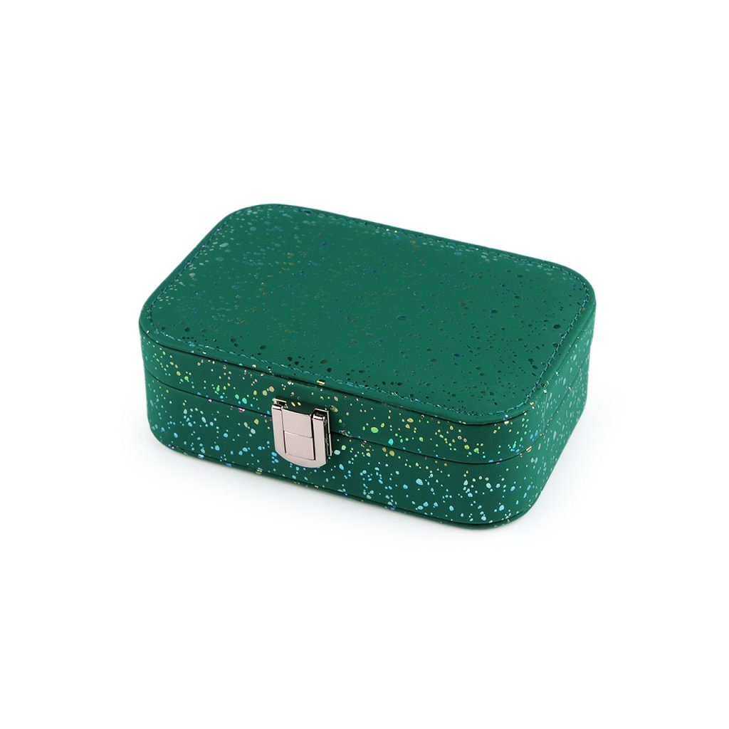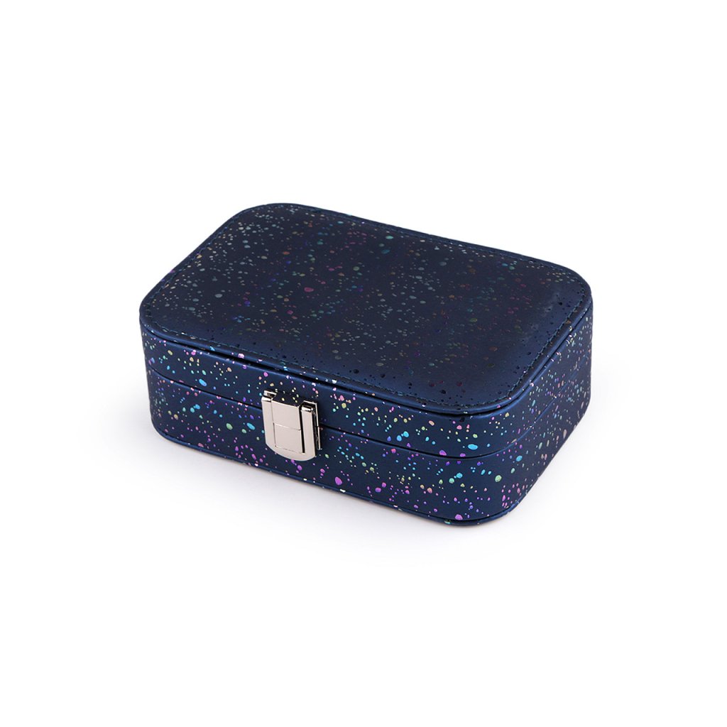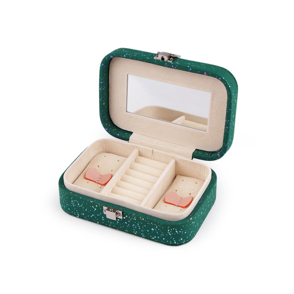 Malá šperkovnice má povrch posetý drobným metalickým potiskem, který se duhově leskne. Uzavírá se na kovové zapínání, spolehlivě ochrání šperky před nepříznivými vlivy okolí jako je světlo nebo vlhkost. Uvnitř šperkovnice jsou 2 přihrádky s polštářky na náušnice, oddíl na prsteny a zrcátko. Šperkovnice má velice kvalitní a precizní provedení.