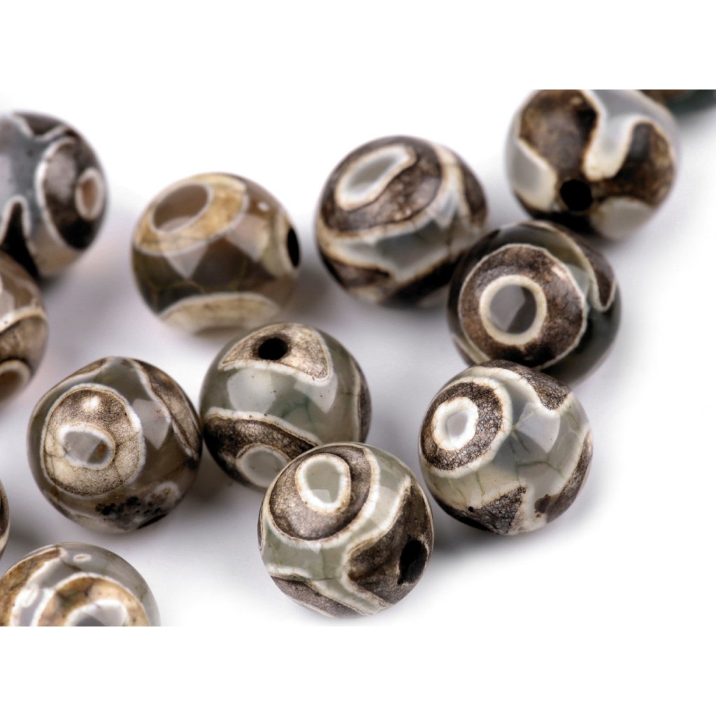 Tibetské kulaté korálky z přírodního achátu jsou speciálně upravené do tzv. dZi stylu. Každý korálek je unikátní. Jsou oblíbené především šperkaři pro svou jedinečnou kresbu s oky. Svou velikostí jsou ideální na výrobu Buddhových náramků. Jsou oblíbené na techniku drátování, v kombinaci s drahými kovy, ale i s obyčejnými drátky. Skvěle vypadají i na jednoduchých návlekových šňůrách, které zajímavě ozvláštní.