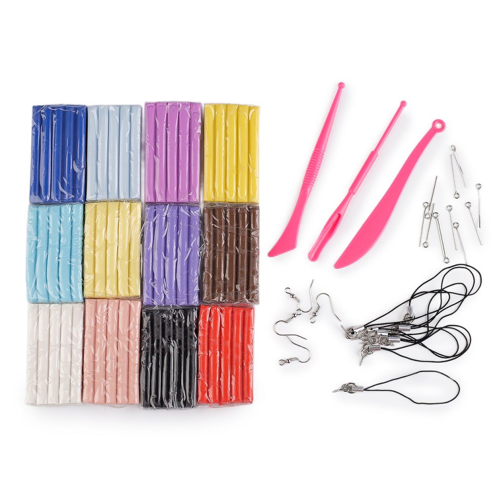 Sada modelovacích polymerových hmot obsahuje 12 ks různých barev. Uvnitř balení najdete i modelovací nářadí a bižuterní komponenty - afroháčky, poutka a ketlovací jehly. (Jednotlivé bižuterní komponenty se v baleních mohou lišit).
