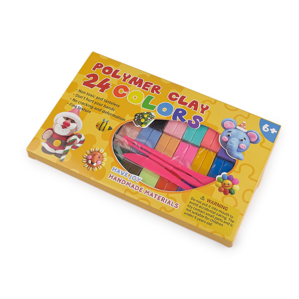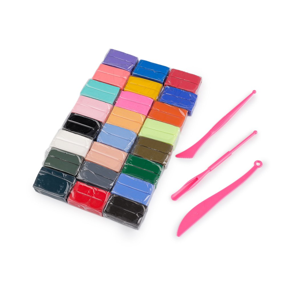 Sada modelovacích polymerových hmot obsahuje 24 ks různých barev. Uvnitř balení najdete i praktické modelovací nářadí a fotonávody.