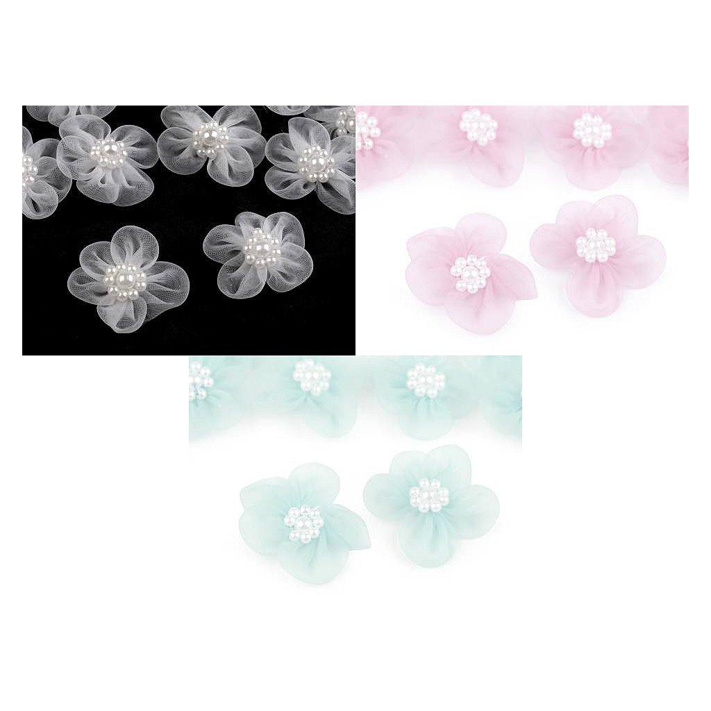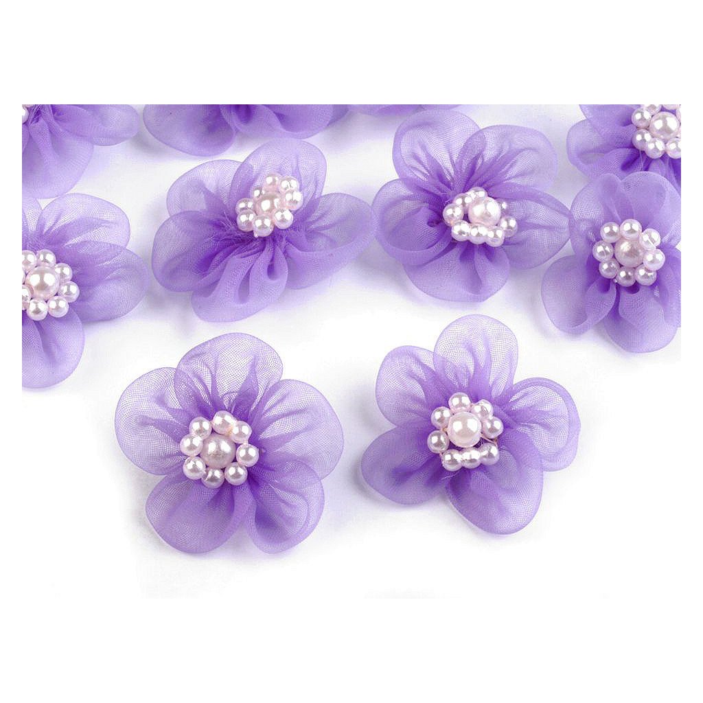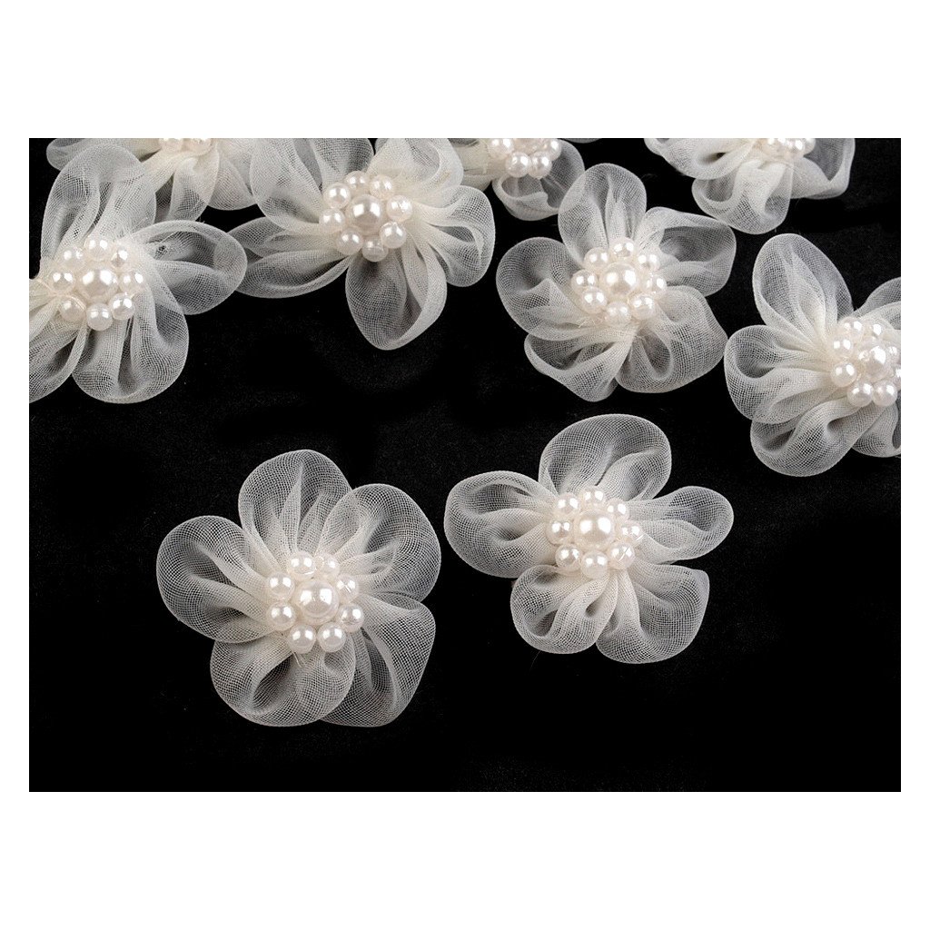 Jemný monofilový květ je velice vzdušný. V jeho středu jsou našité lesklé perličky.