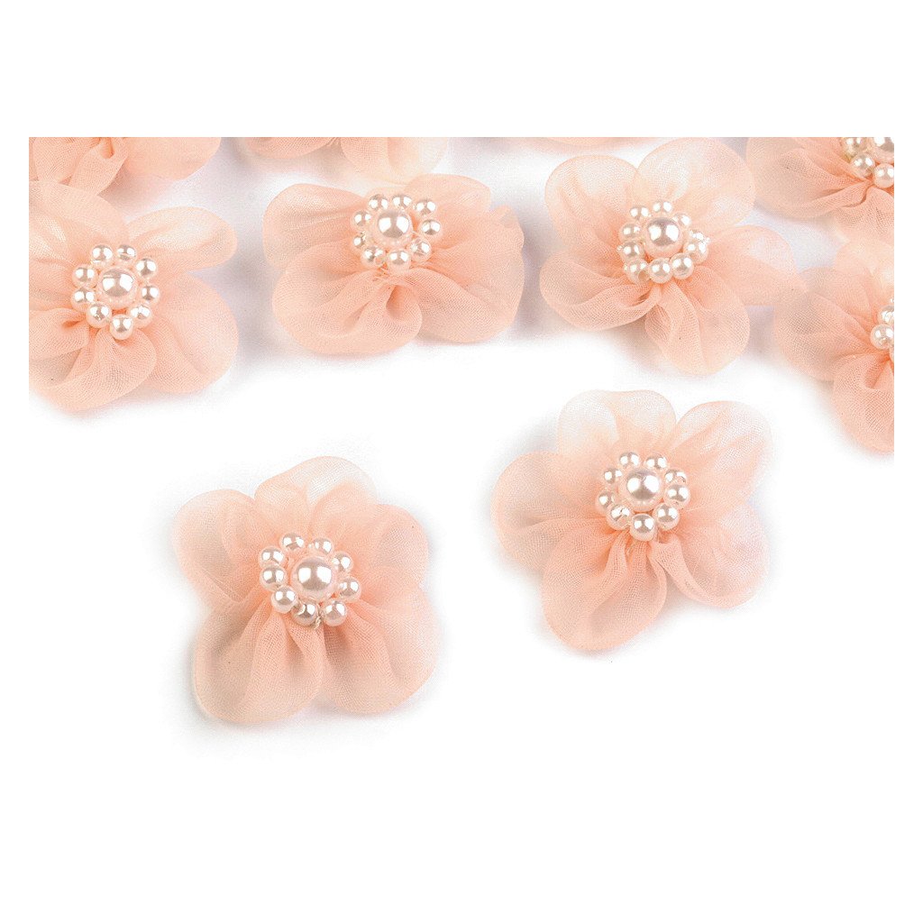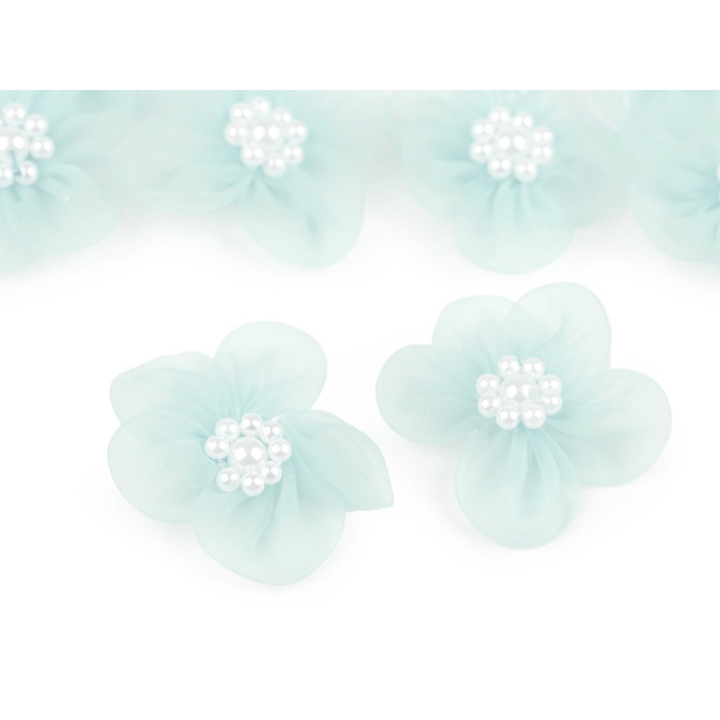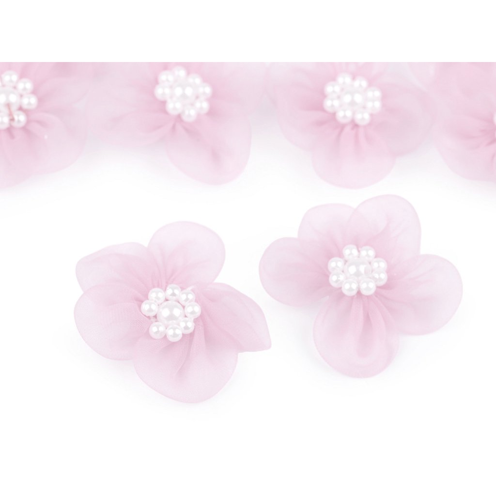 Jemný monofilový květ je velice vzdušný. V jeho středu jsou našité lesklé perličky.