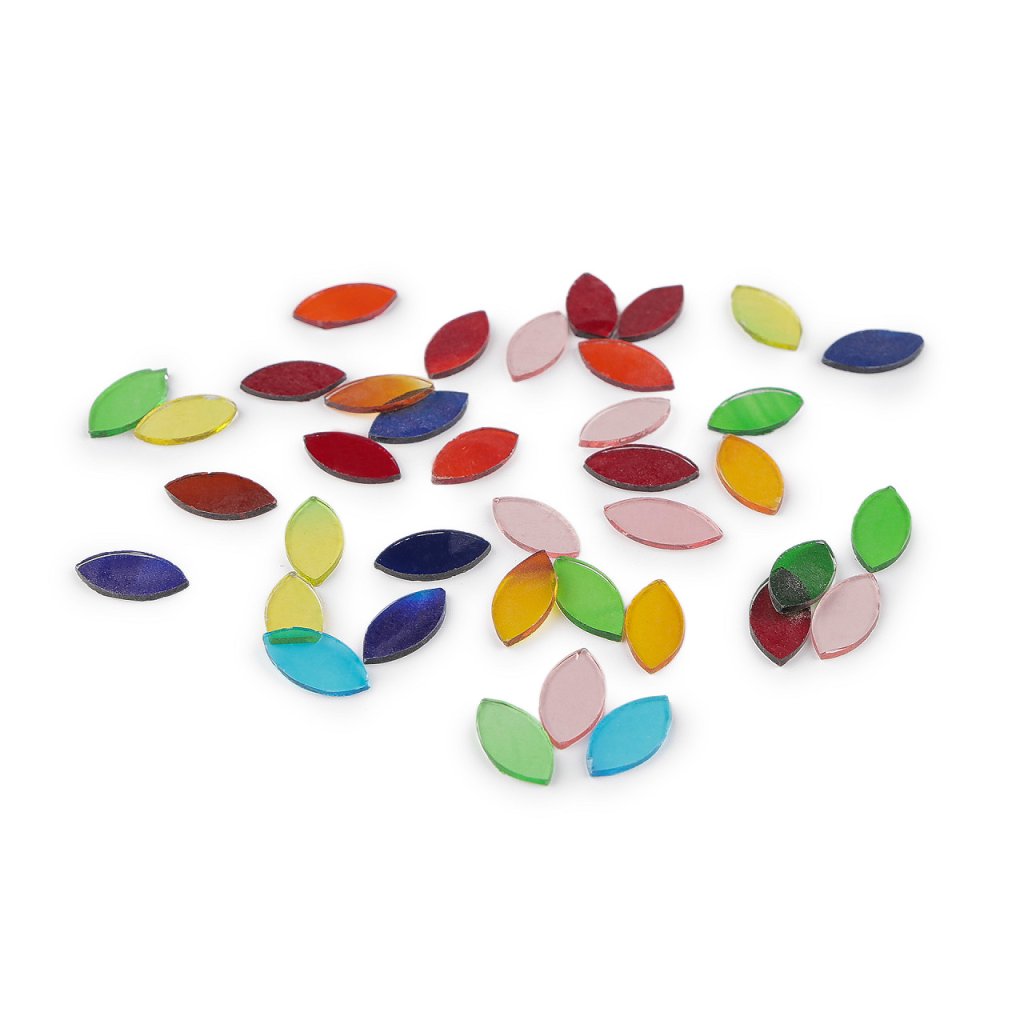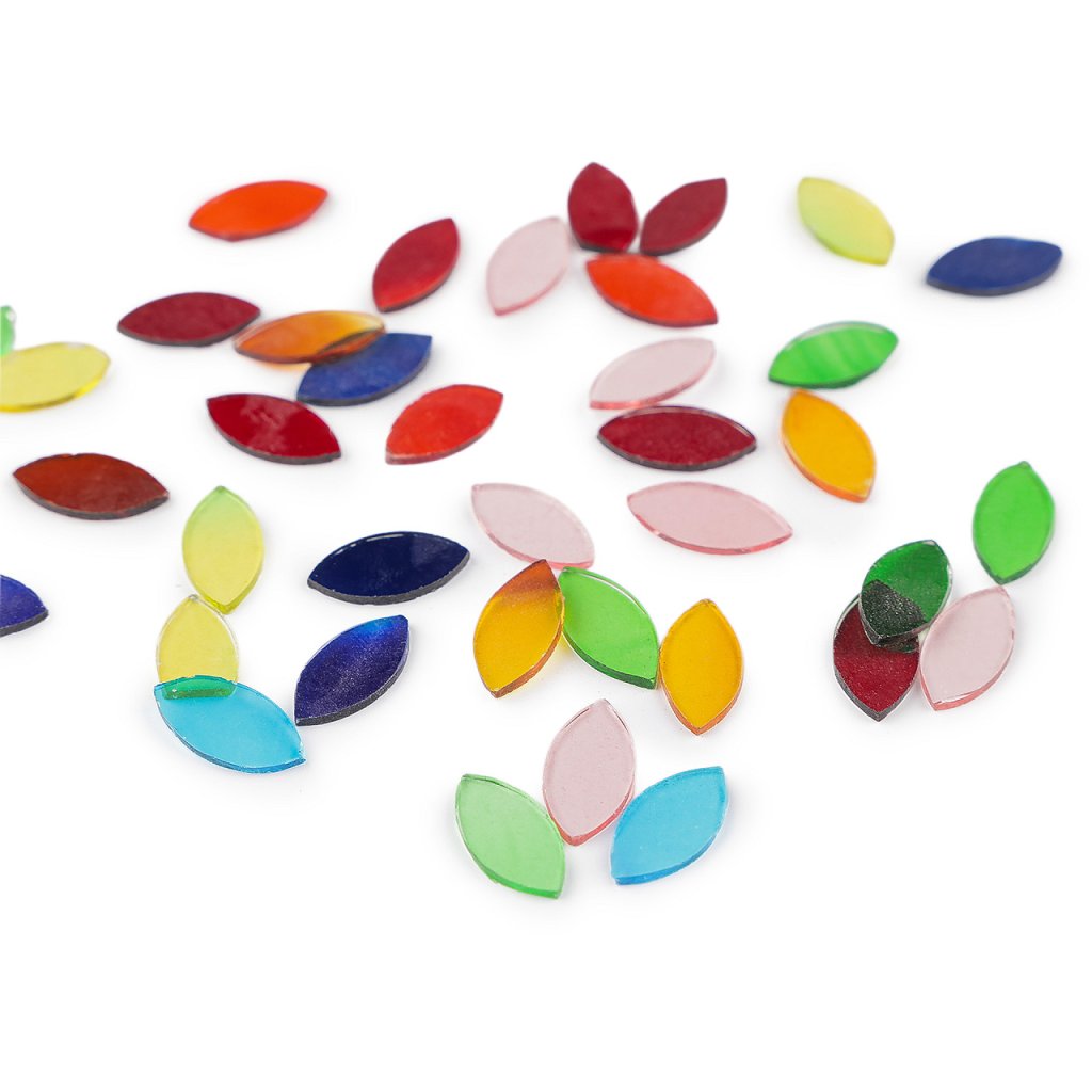 Barevný mix skleněných kamínků ve tvaru listu využijete na výrobu mozaiky. Dají se skládat do zajímavých obrazců. Jsou transparentní, hodí se k nalepení na materiály jako je plast, dřevo, kámen, kov, keramika a jiné. Mozaikou můžete ozdobit kartónové a dřevěné krabičky, květináče, šperkové polotovary, skleněné vázy, svícny, lahve, amfóry, kameny apod.
