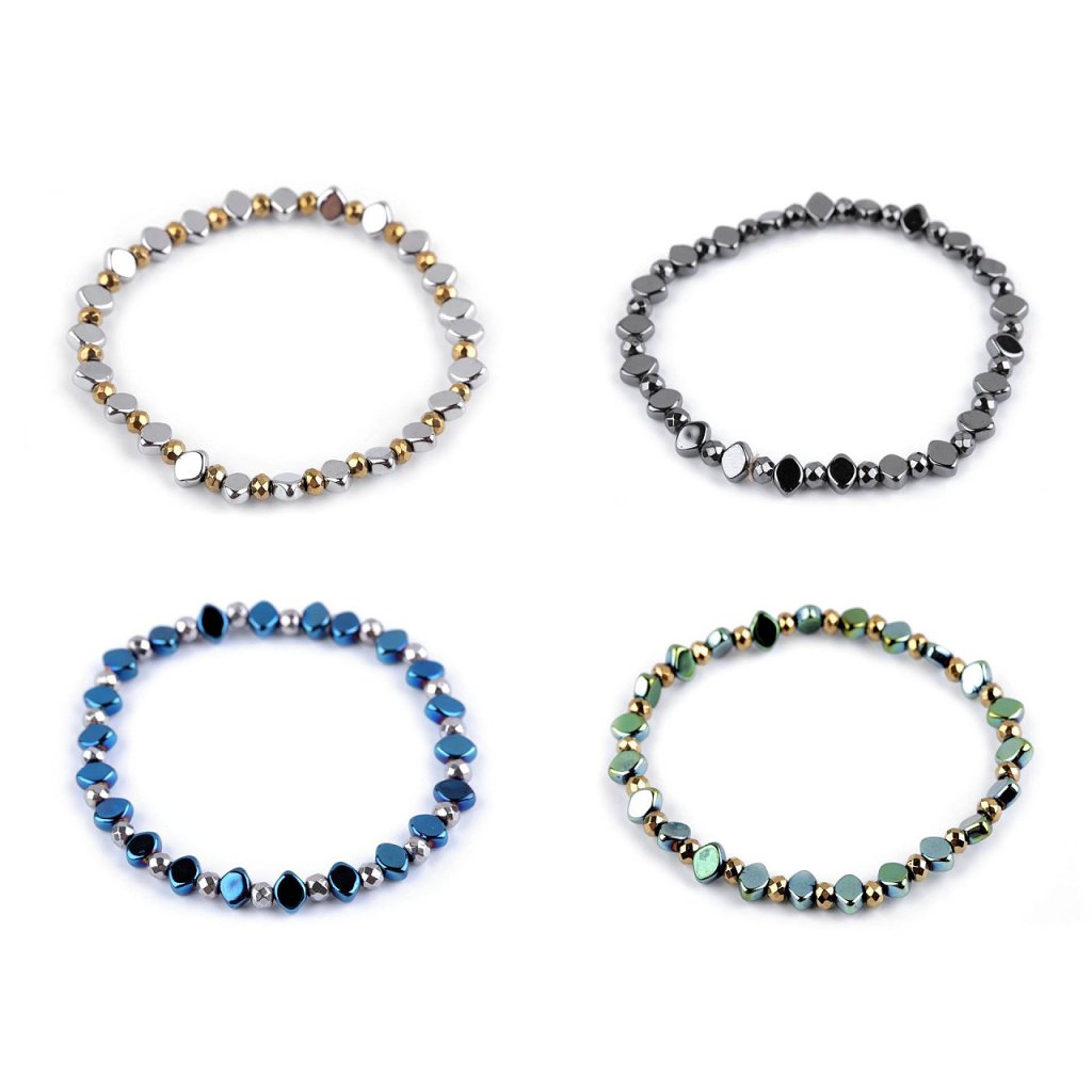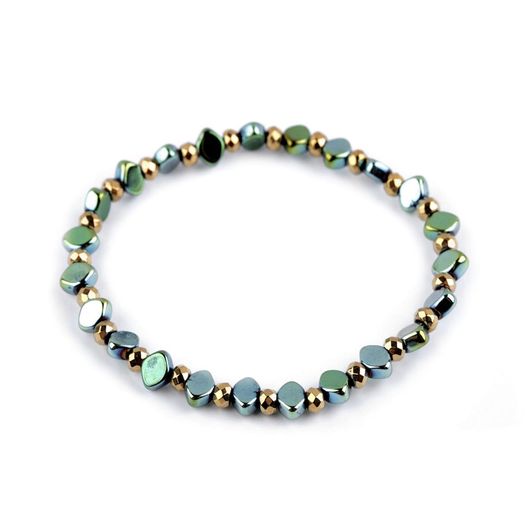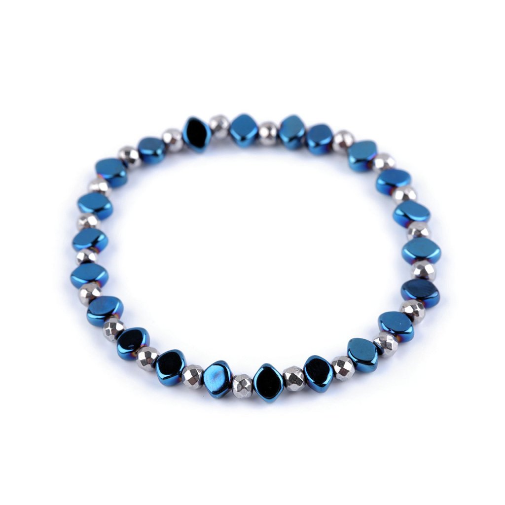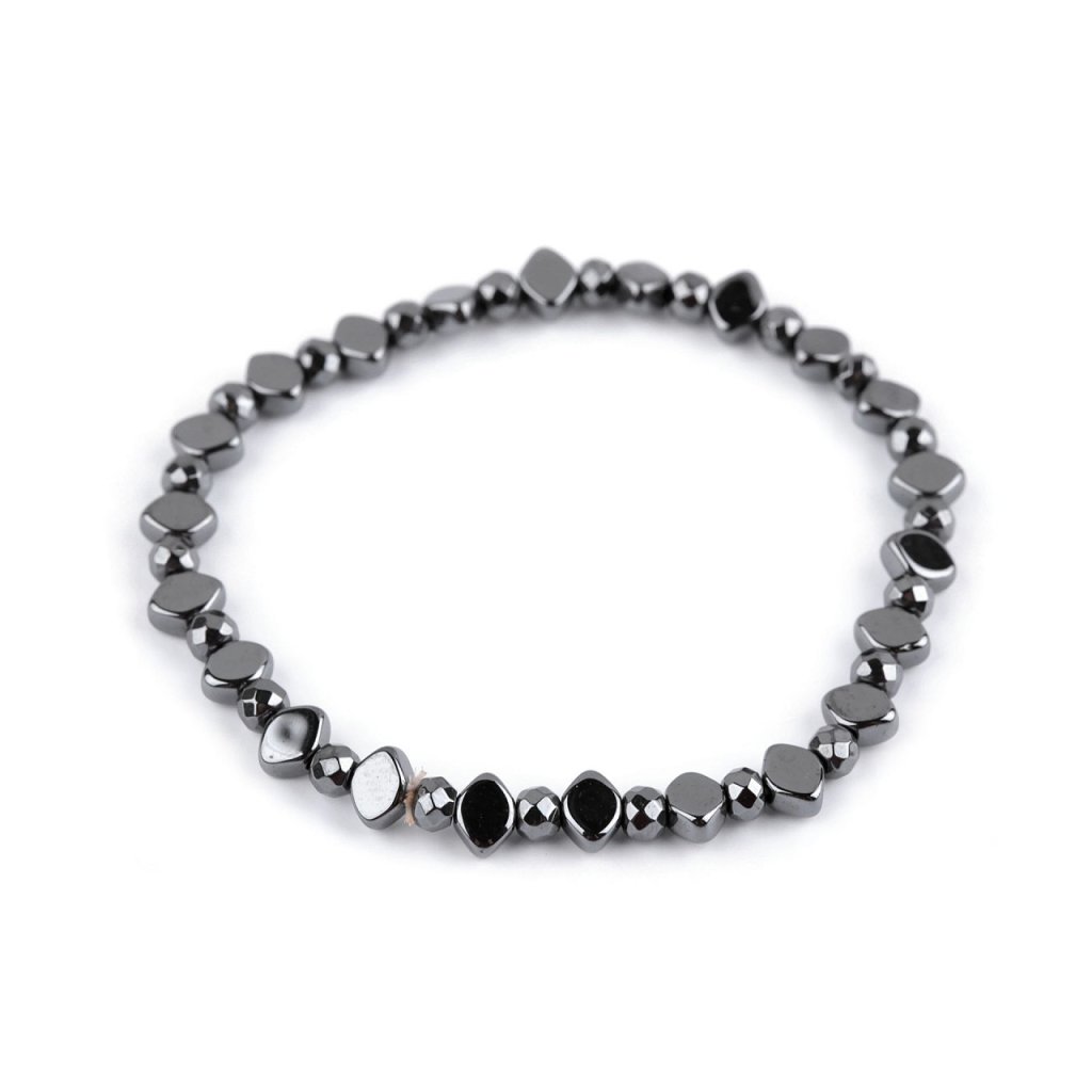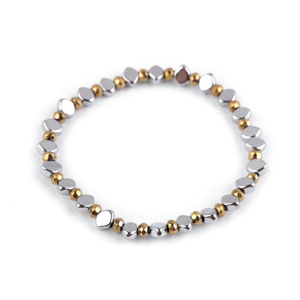 Elegantní náramek je vyrobený z broušených korálků pokoveného hematitu. Díky pružence se náramek snadno natáhne na ruku, má univerzální velikost. Hematitový náramek patří mezi šperky, které díky své fascinující povrchové úpravě zaujmou na první pohled. Broušené plošky vytvářejí efektní světelné odlesky. Náramek potěší každou ženu, je dárkem, se kterým nešlápnete vedle. Hodí se ke slavnostním příležitostem, skvěle podtrhne i business styl oblékání.