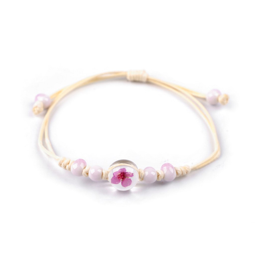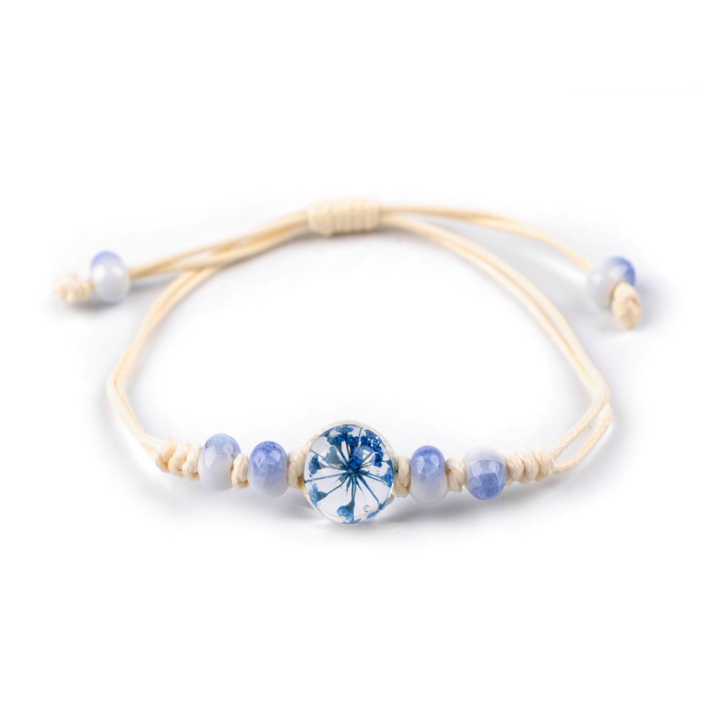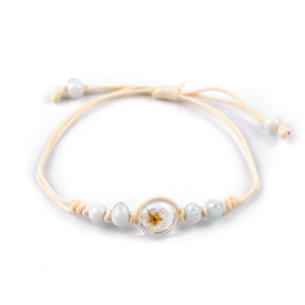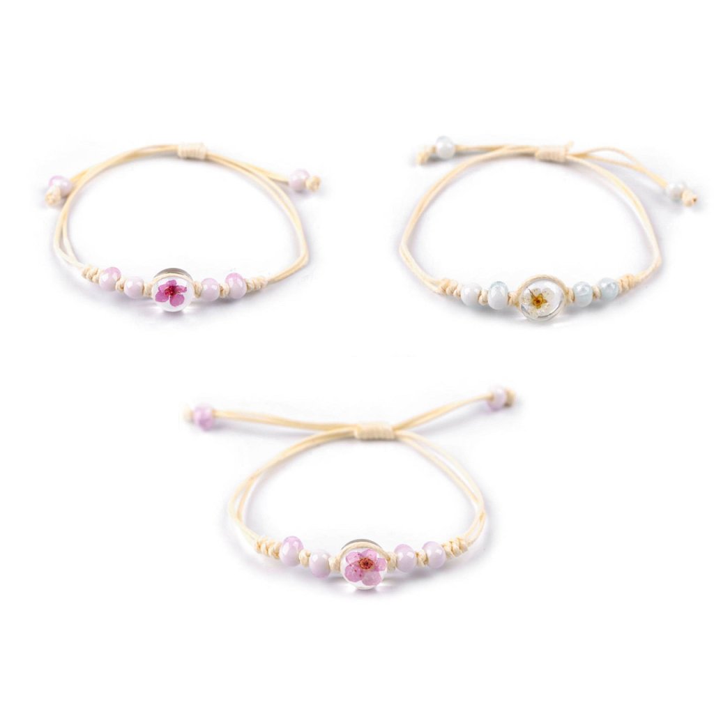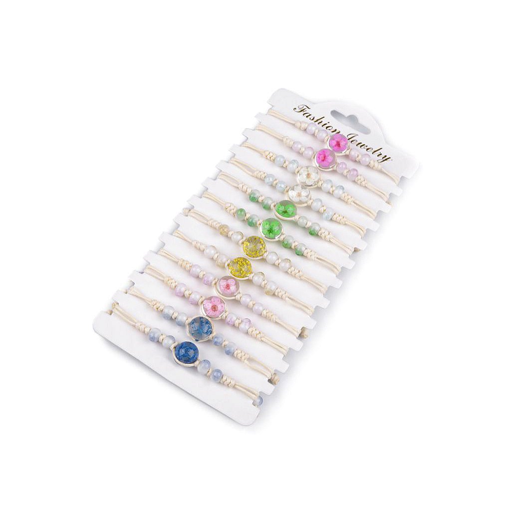 Shamballa náramek s květinovým korálkem působí na zápěstí velice romanticky. Pravý přírodní kvítek je zalitý do křišťálové pryskyřice, je doplněný skleněnými korálky. Náramek se hodí jak k šatům, tak k halenkám, tričkům i plavkám. Prodávají se jako sada 12 ks na papírové kartě k zavěšení, každý náramek má jinou barvu.