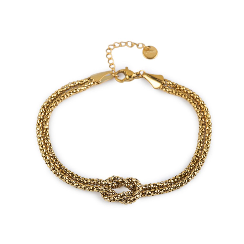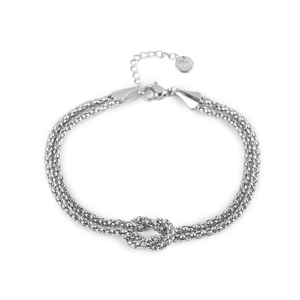 Dvouřadý náramek je vyrobený z kvalitní nerezové oceli. Ozdobným prvkem je uzel uprostřed náramku. Detailní zpracování a jednoduchý design z něj činí dokonalý módní doplněk pro jakoukoliv příležitost.
