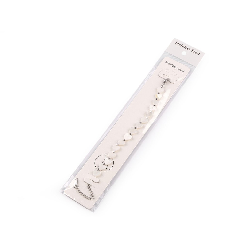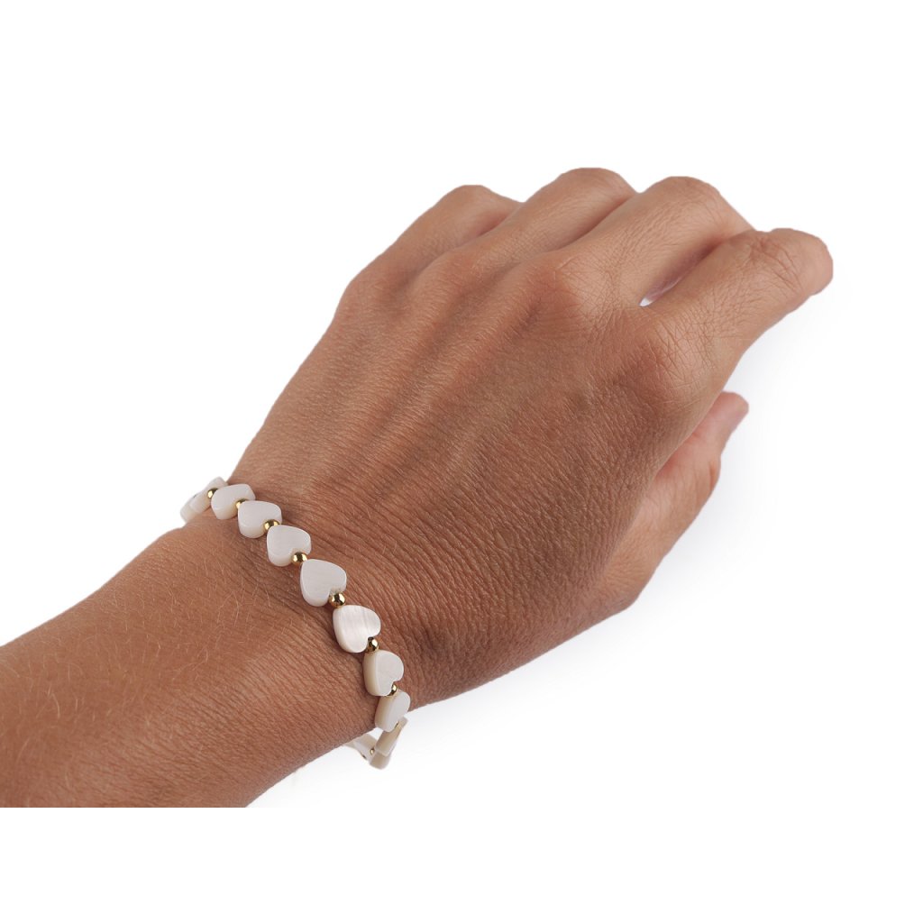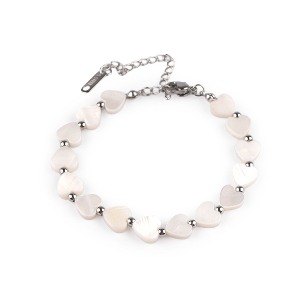 Perleťový náramek zaujme svou elegantní jednoduchostí a jemným designem. Je celý poskládaný z perleťových srdíček a nerezových korálků. Náramek má kvalitní zpracování, romanticky dozdobí vaše zápěstí. Bude krásným a stylovým dárkem nejen na Valentýna, díky univerzálnímu designu se hodí k různým stylům oblečení, bude skvělým dárkem pro někoho výjimečného.