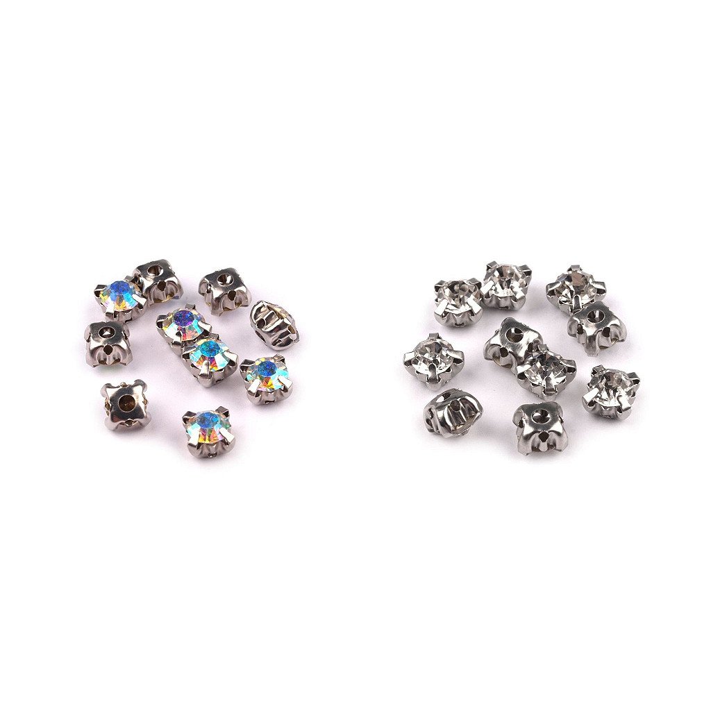 Skleněné kameny v kovovém pouzdře se díky efektnímu broušenému povrchu jemně třpytí. Čtvercové kovové lůžko se čtyřmi otvory umožňuje snadné našívání.