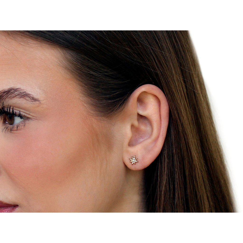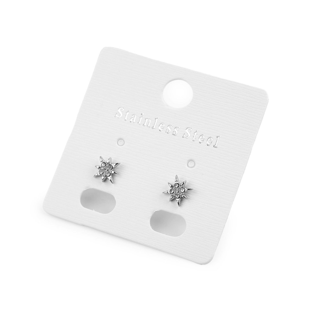 Decentní mini náušnice jsou vyrobené z kvalitní nerezové oceli. Mají tvar hvězdičky, která je uvnitř ozdobená třpytivými broušenými kamínky.
