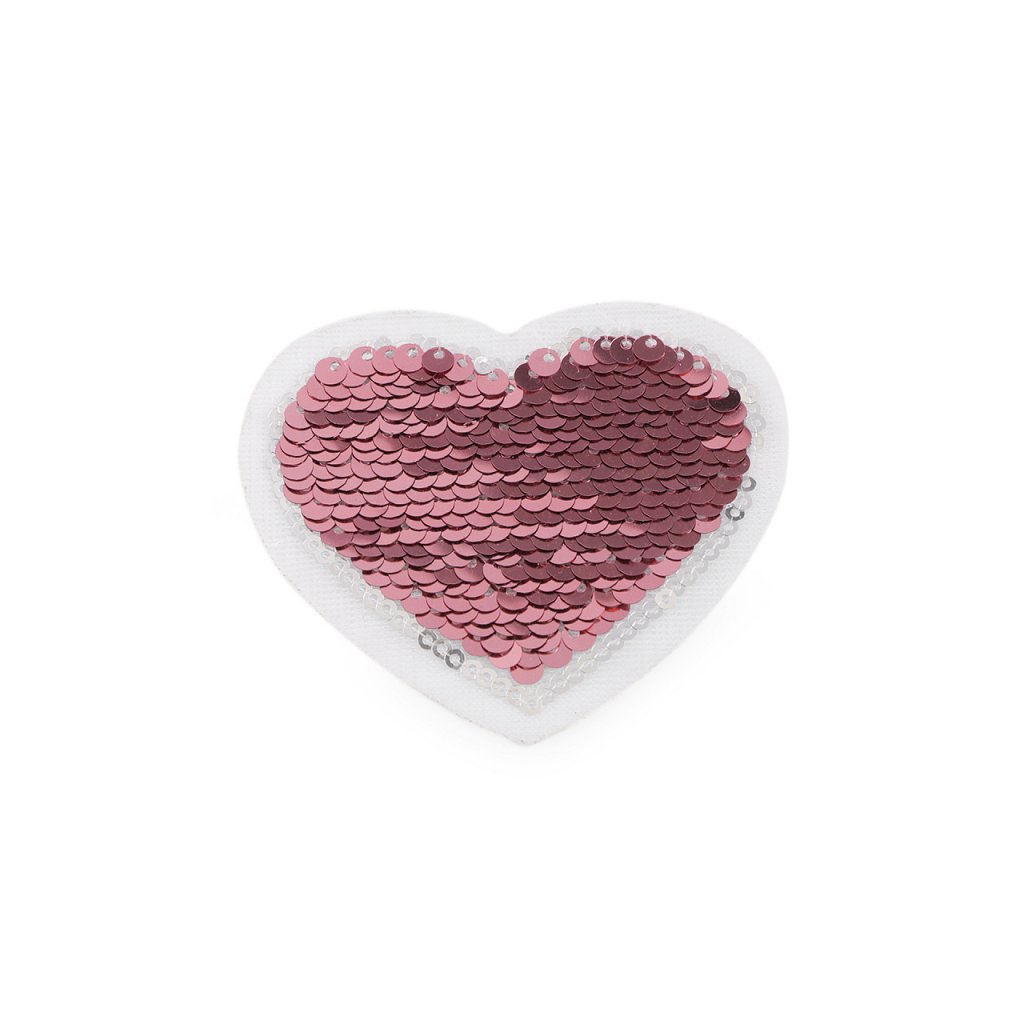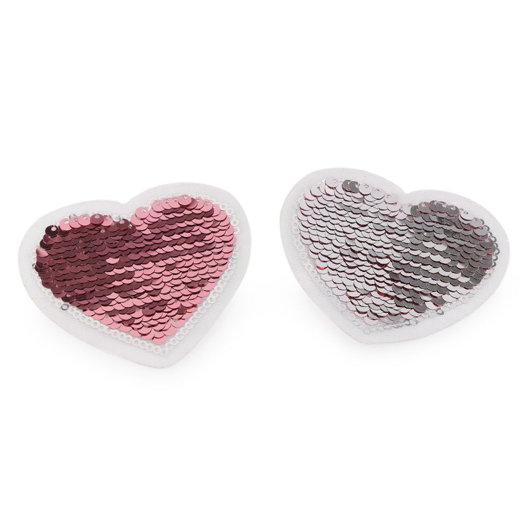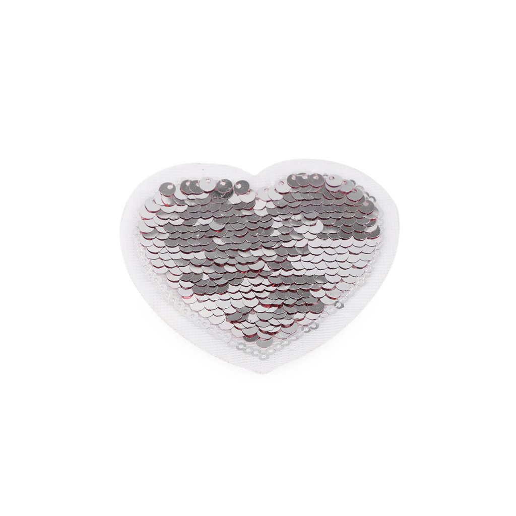 Nažehlovačka srdce, je po bocích zdobená stříbrnými flitry. Flitry uvnitř srdce jsou důmyslně našité, po jejich pohlazení proti směru se otočí a ukáží svou druhou, jinak barevnou stranu. Jsou oblíbené zejména u dětí a teenagerů, kteří si tak mění vzhled svého oblečení. Nažehlovačky mají kvalitní provedení, spodní stranu tvoří lepicí vrstva, která po nažehlení pevně drží na látce.