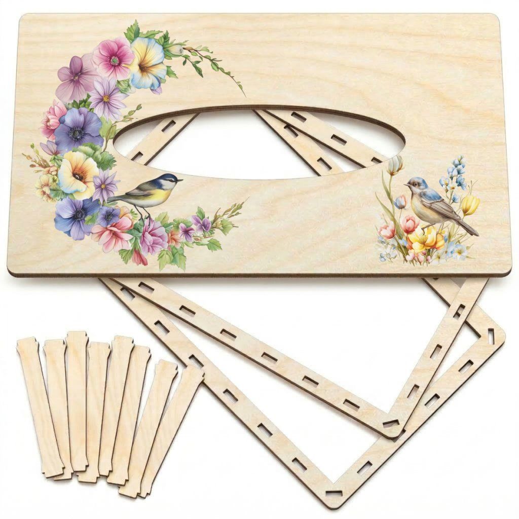 Obdélníková konstrukce z přírodní březové překližky s nádherným barevným UV potiskem drobných ptáčků a rozkvetlých květin je navržena pro snadné a rychlé vyplétání. Získáte tak pevný a elegantní kryt s romantickým motivem, který jednoduše nasadíte shora na běžnou papírovou krabici s kapesníky z obchodu.