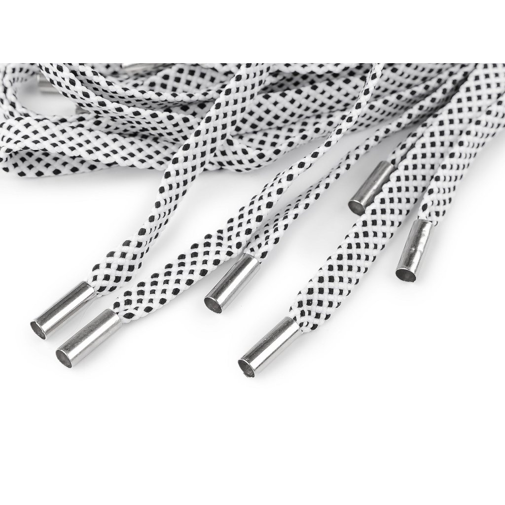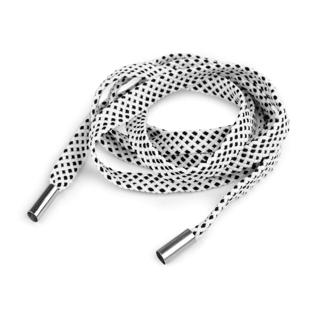 Pevná oděvní šňůra je plochá, s károvaným vzorem. Na obou stranách má kovovou koncovku. Délka koncovek je 1,8 cm.