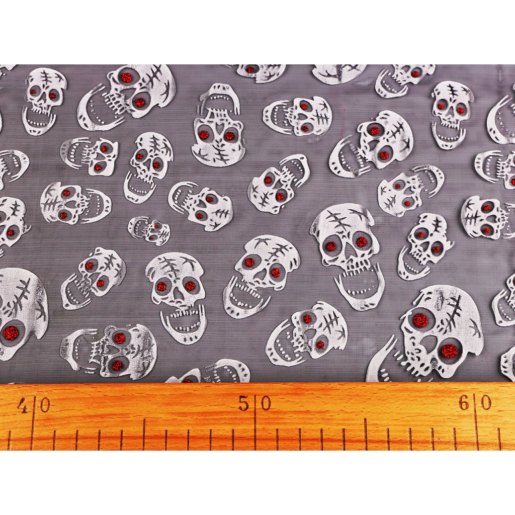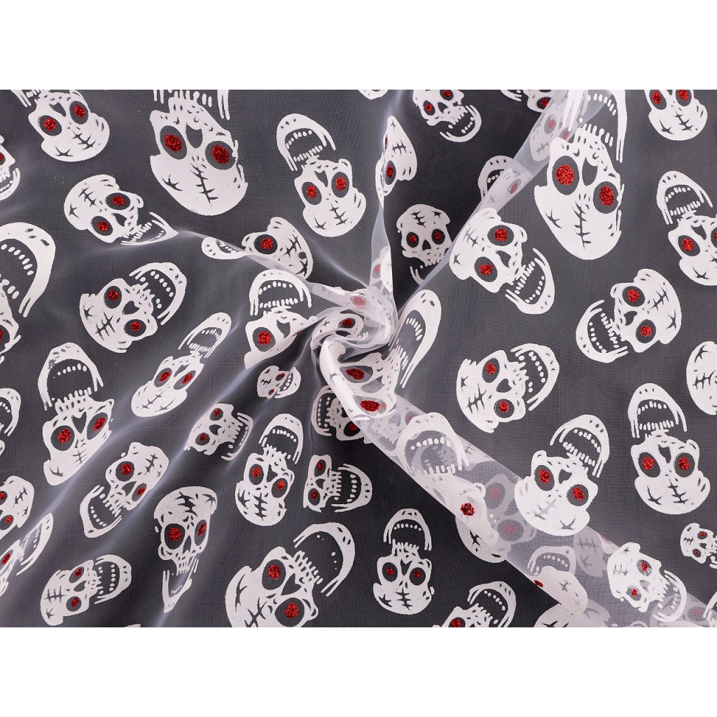 Organza s potiskem lebek se skvěle hodí k halloweenskému aranžování, ozdobení stolu nebo k výrobě karnevalových kostýmů. Oči lebek jsou glitrové.