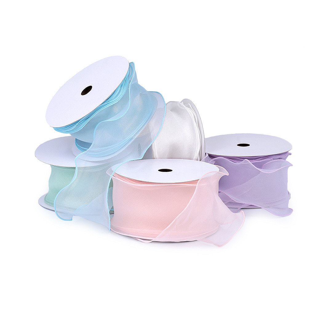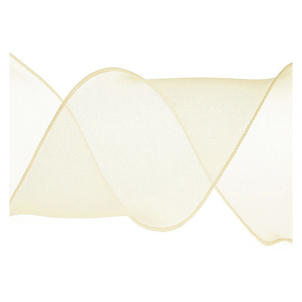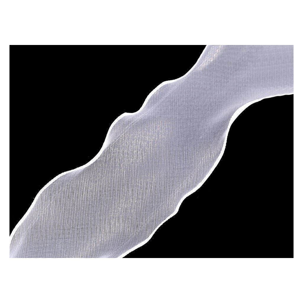 Široká monofilová stuha je po stranách ozdobně zvlněná. Je průsvitná, s jemným zlatavým perleťovým leskem.
