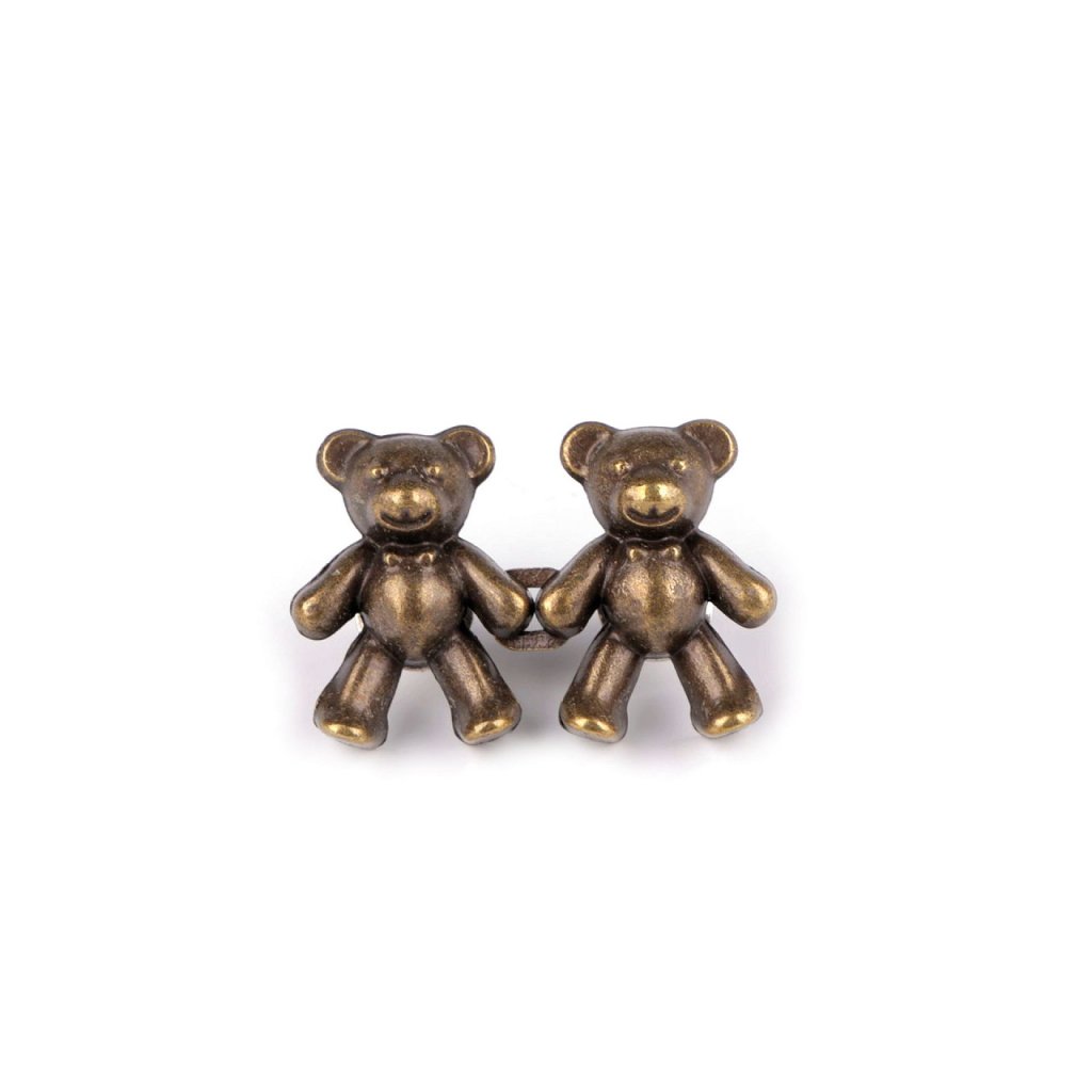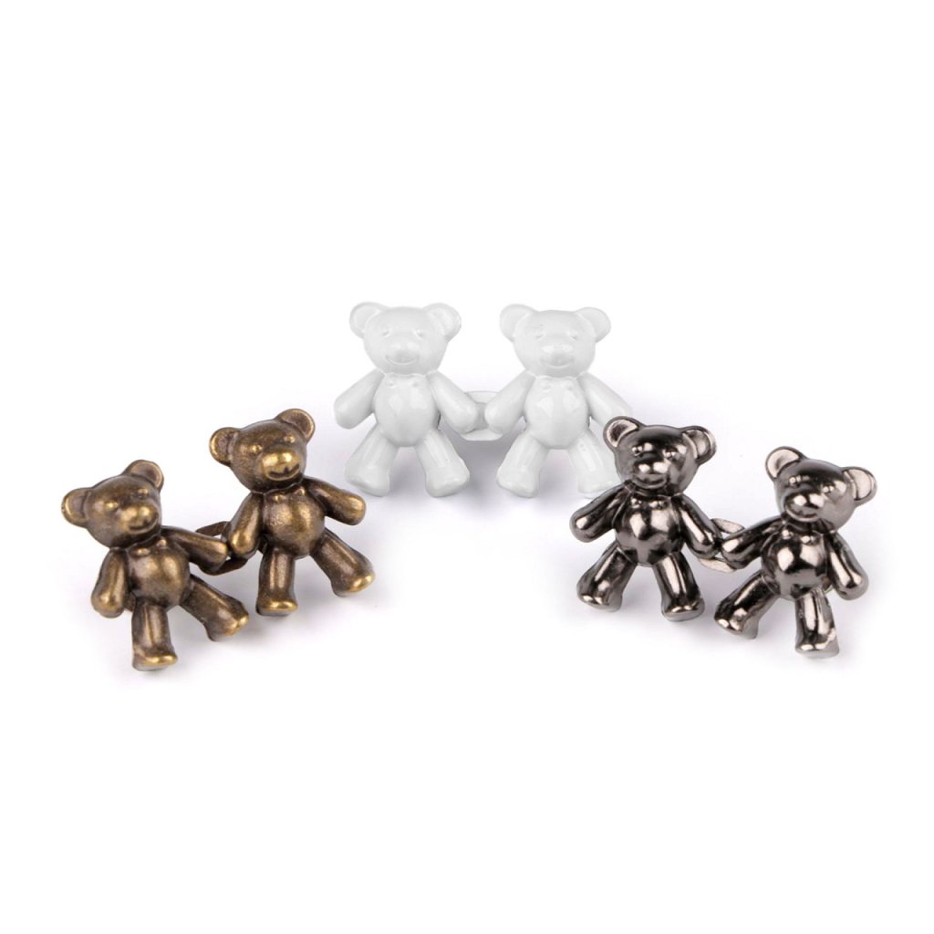Ozdobné kovové zapínání s medvídky se skládá ze dvou částí, které do sebe zaháknete. Dá se opakovaně používat bez nutnosti přišití, protože má praktické jednobodové připnutí jako odznak. Poslouží tak i jako designový zkracovač v pase kalhot nebo sukní.