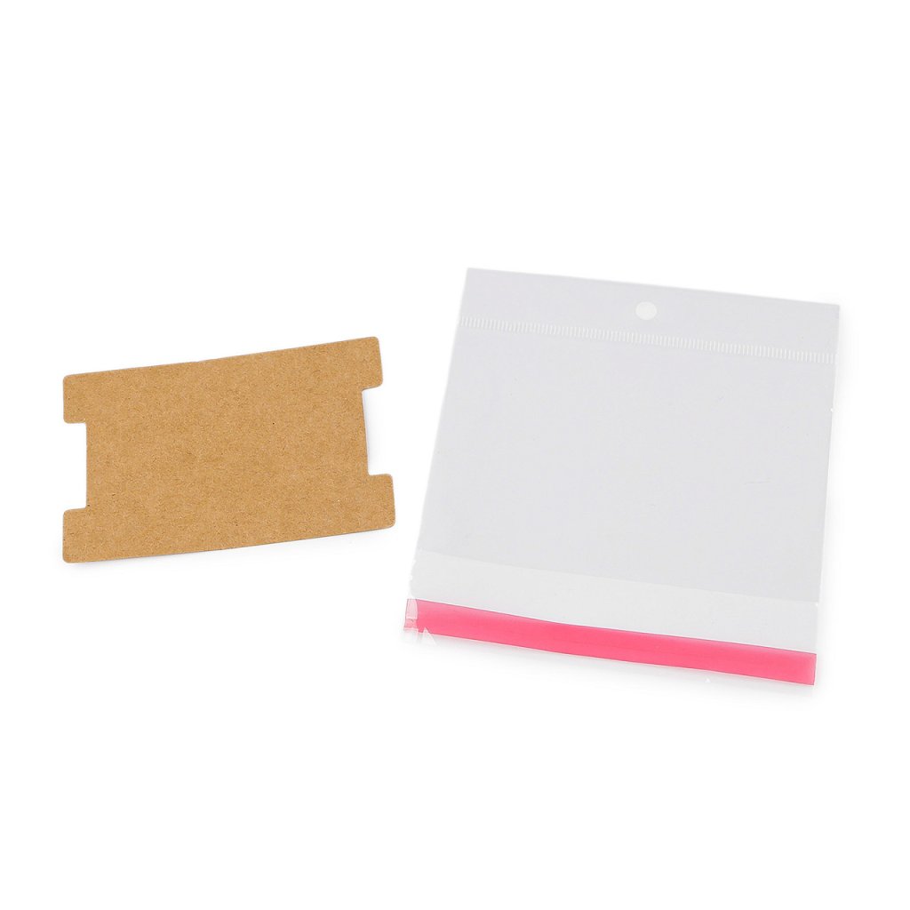 Karta na bižuterii se sáčkem je ideálním pomocníkem pro každého, kdo hledá elegantní a praktický způsob, jak prezentovat a uchovávat šperky. Bižuterní karta je určená na navléknutí náramku nebo gumičky. Je vhodná na prodej či prezentaci vašich výrobků, dá se na ni psát. Povrch karty je hladký. Součástí karty je také sáček s eurozávěsem, který se uzavírá lepicí lištou.