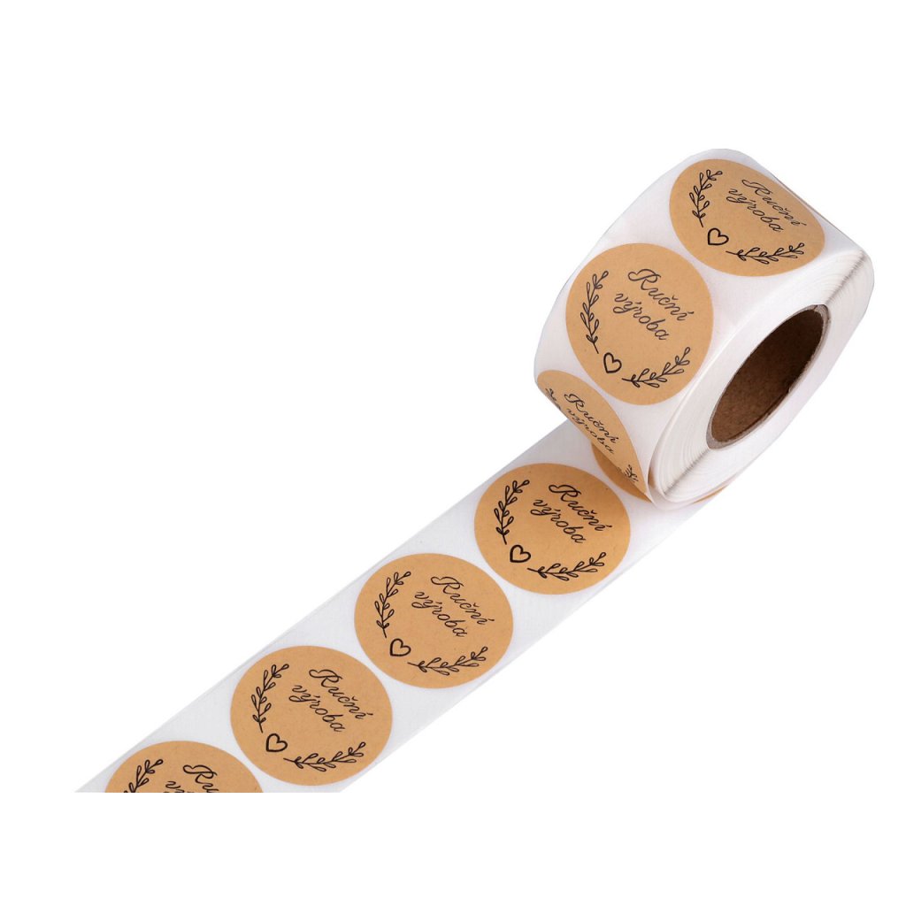 Kulaté papírové samolepky zdobí nápisy "Ruční výroba". Využijete je na označení vašich výrobků, na zdobení přáníček, deníků, dárků, foto rámečků, alb, pozvánek, krabiček apod.