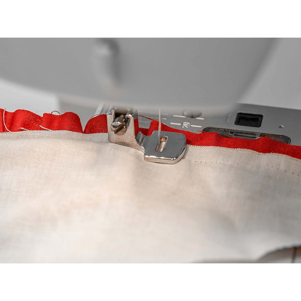 Kovová řasící patka je vhodná pro rychlé nařasení látek. Patka nařasí jednu vrstvu látky a současně ji může přišít k druhému nenařasenému kusu látky.