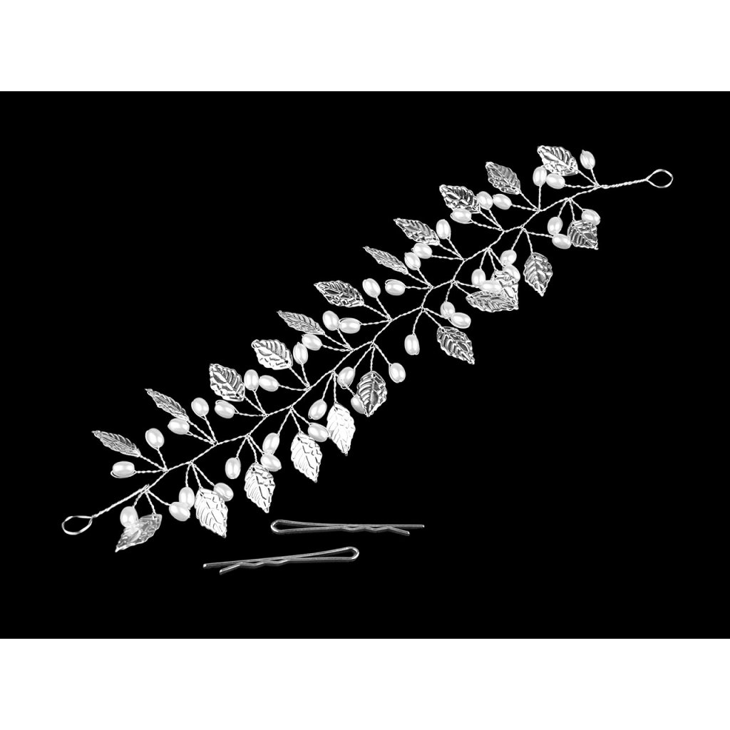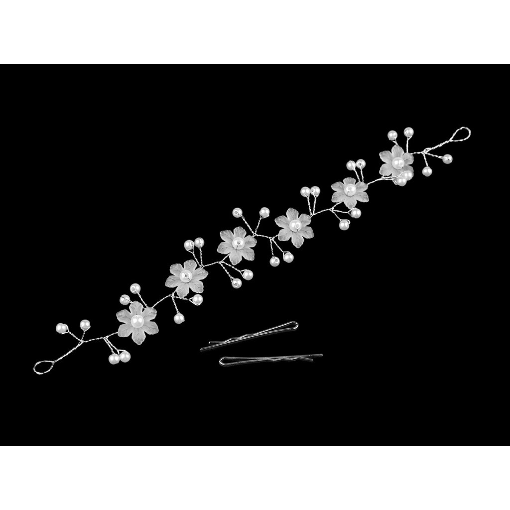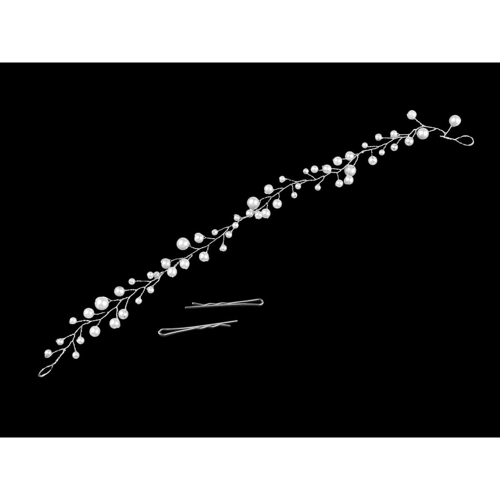 Romantická ozdoba s perlovými korálky bude jemným a elegantním doplňkem vašich vlasů. Je tvořená z dvou do sebe zapletených drátků, do kterých jsou vkomponované voskové korálky připomínající perly a další ozdoby.