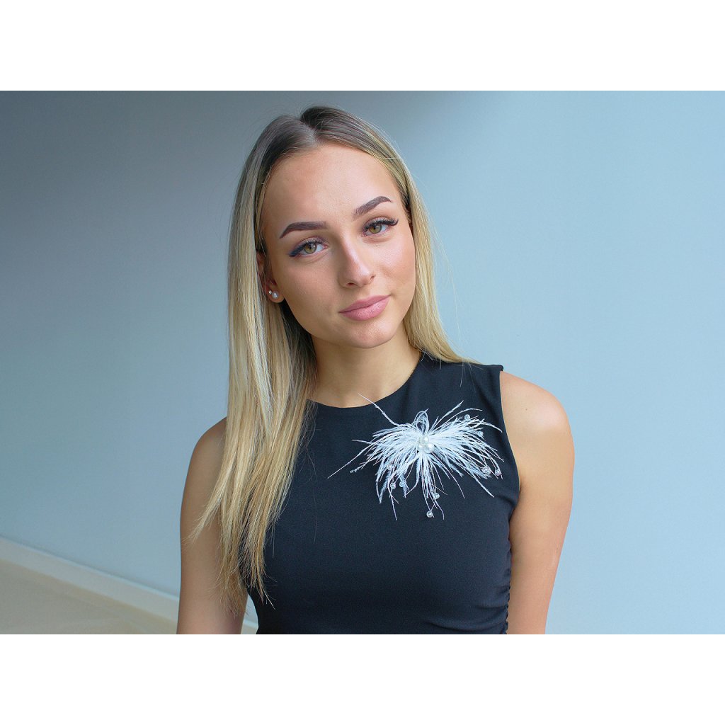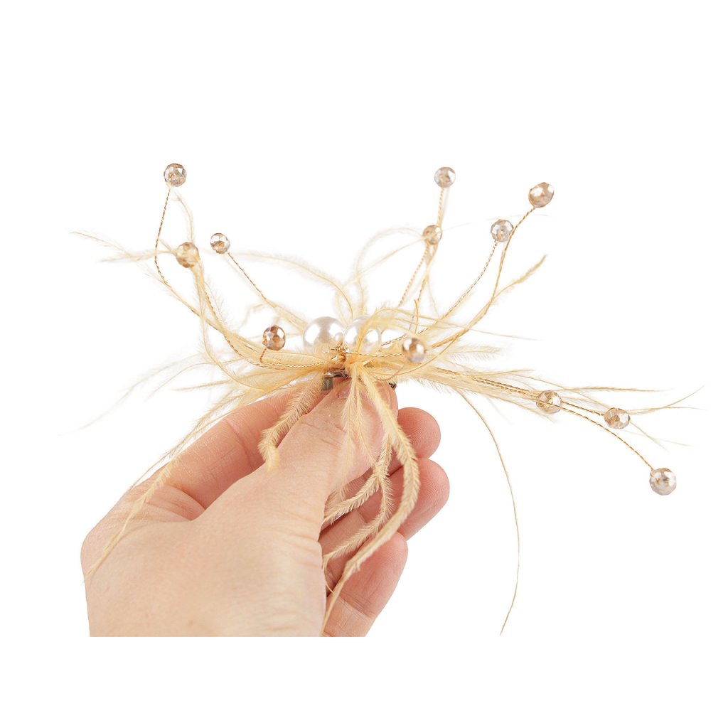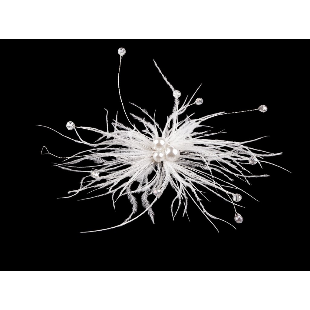 Velká elegantní brož je ozdobená perlami, broušenými korálky a nadýchaným pštrosím peřím. Je naprosto úchvatná, navozuje dojem rozevlátého střapatého květu či sněhové vločky. Díky drátkům ji můžete libovolně tvarovat. Můžete ji nosit na oděvech, kloboucích, kabelkách či s ní můžete sepnout šátek. Na zadní straně má brožový špendlík.