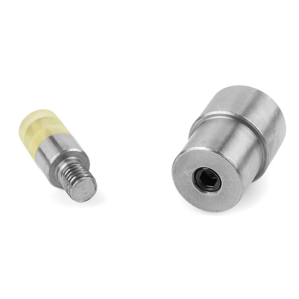 Piston má dvě části. Větší část pistonu, do které se vkládá nýt, umístíme v dolní části lisu. Druhou část zašroubujeme do lisu a vložíme vhodný komponent k nýtování.