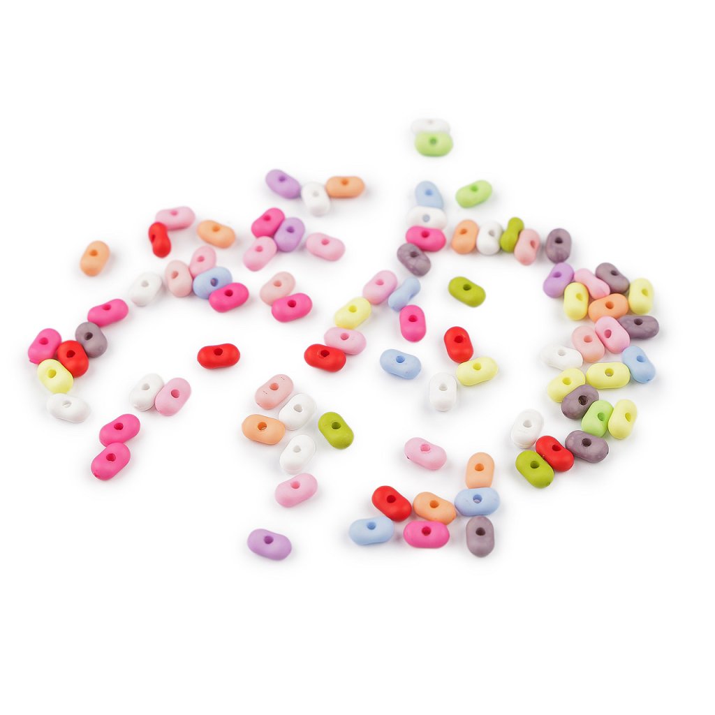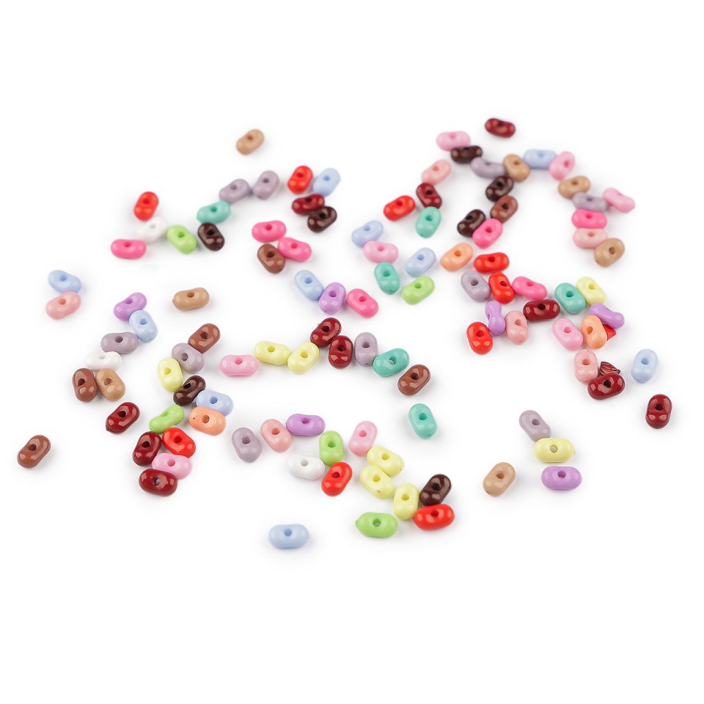 Malé plastové korálky mají zajímavý tvar arašídů. V barevném mixu představují dokonale hravý a veselý prvek pro každého milovníka tvoření. Na obou koncích jsou buclaté, uprostřed zmáčknuté, průvlek mají umístěný uprostřed korálku. Po navlečení vedle sebe vytváří zajímavý 3D efekt. Mají syté barvy, jsou velice kvalitní, všude hladké, nemají žádné otřepení nebo viditelné švy. Využijete je na výrobu bižuterie a zdobení oděvů, tašek či dekorací do bytu.
