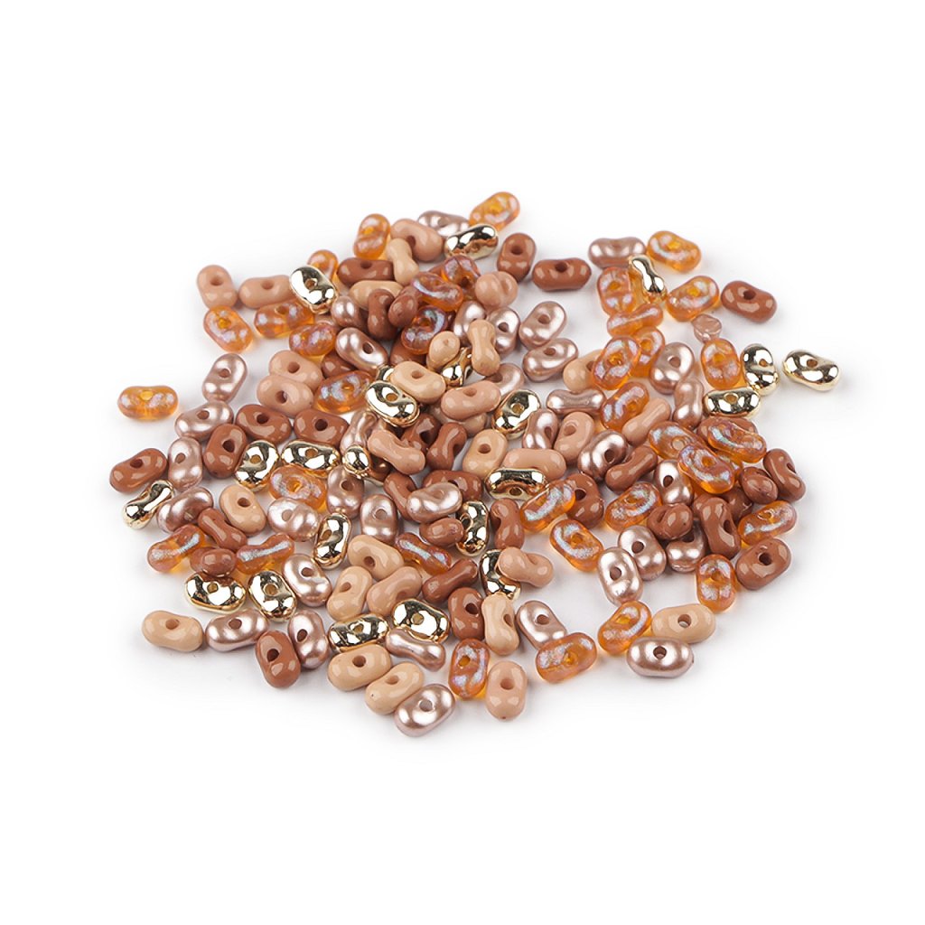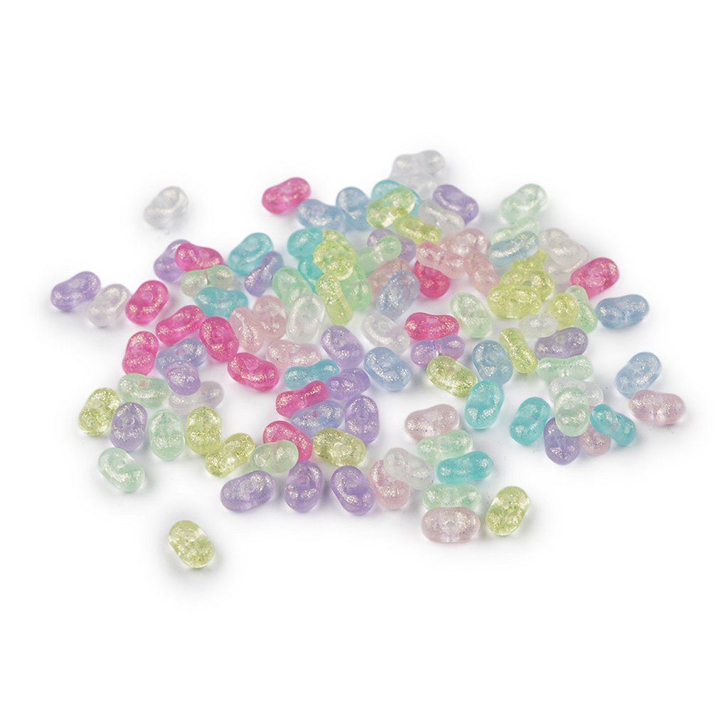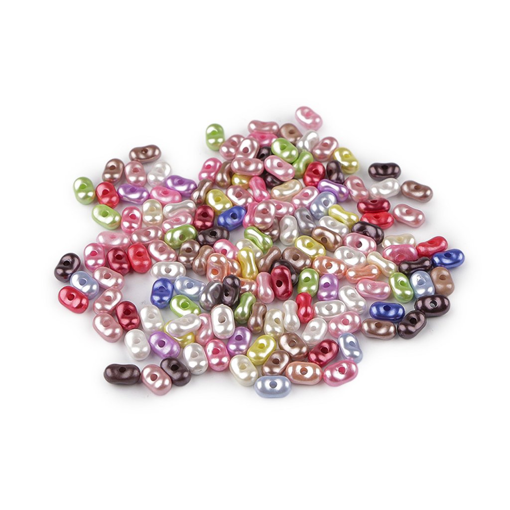 Malé plastové korálky mají zajímavý tvar arašídů. Na obou koncích jsou buclaté, uprostřed zmáčknuté, průvlek mají umístěný uprostřed korálku. Po navlečení vedle sebe vytváří zajímavý 3D efekt. Mají syté barvy, jsou velice kvalitní, všude hladké, nemají žádné otřepení nebo viditelné švy. Využijete je na výrobu bižuterie a zdobení oděvů, tašek či dekorací do bytu.