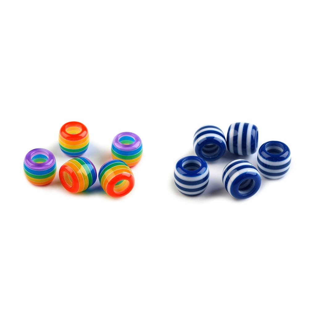 Plastové korálky s velkým průvlekem mají veselý proužkovaný design. Jsou velice kvalitní, všude hladké, nemají žádné otřepení nebo viditelné švy. Mají nízkou hmotnost. Využijete je do krátkých i dlouhých náhrdelníků nebo náramků. Jako návlekový materiál jsou vhodné šperkové šňůrky nebo hadí řetízky. Korálky můžete navlékat na větší množství tenkých šňůrek, které se mezi sebou různě uzlují a svazují a tvoří tak zajímavý celek. Díky precizně tvarovaného průvleku se hodí i k ozdobení vlasů, např. na copánky, dredy apod.