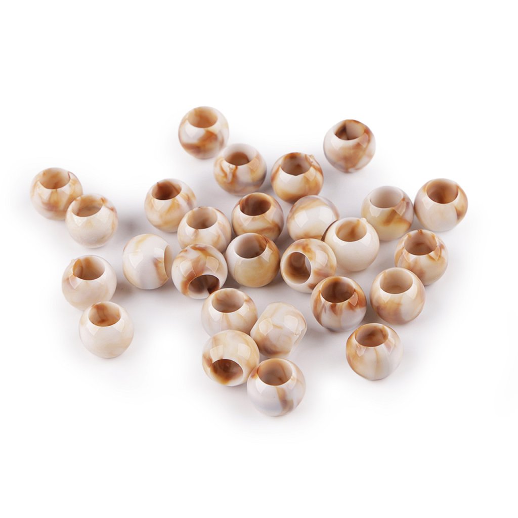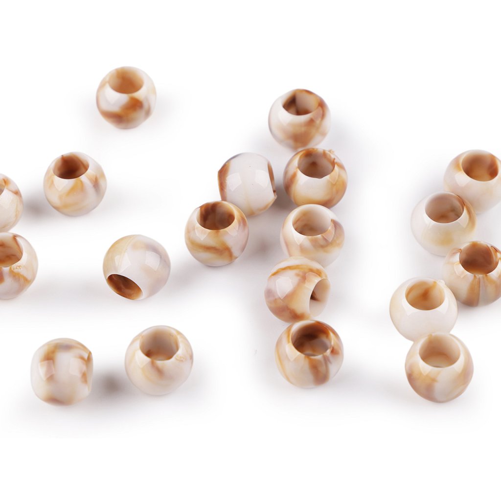 Žíhané plastové korálky s velkým průvlekem jsou zajímavé svým probarvením imitujícím mramor, kdy každý korálek je jiný. Jemně se lesknou, jsou velice příjemné na pohled, působí přírodním dojmem. Jsou velice kvalitní, všude hladké, nemají žádné otřepení nebo viditelné švy. Využijete je na výrobu bižuterie i různých dekorací, např. lapačů snů. Skvěle se kombinují s dalšími korálky různých tvarů a materiálů. Korálky využijete i ke zdobení oděvů, tašek nebo plavek.
