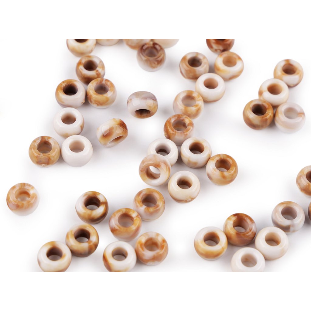 Žíhané plastové korálky s velkým zaobleným průvlekem jsou zajímavé svým probarvením imitujícím mramor, kdy každý korálek je jiný. Jemně se lesknou, jsou velice příjemné na pohled, působí přírodním dojmem. Jsou velice kvalitní, všude hladké, nemají žádné otřepení nebo viditelné švy. Využijete je na výrobu bižuterie i různých dekorací, např. lapačů snů. Skvěle se kombinují s dalšími korálky různých tvarů a materiálů. Korálky využijete i ke zdobení oděvů, tašek nebo plavek.