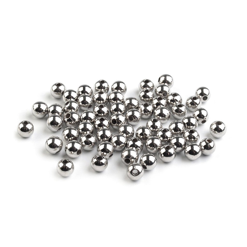 Výrazné plastové korálky ve tvaru kuličky s metalickou, vysoce lesklou úpravou na povrchu.