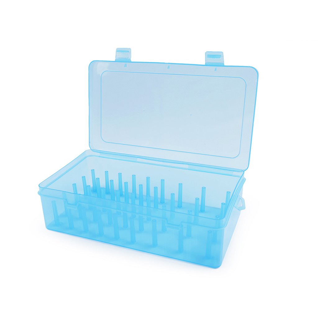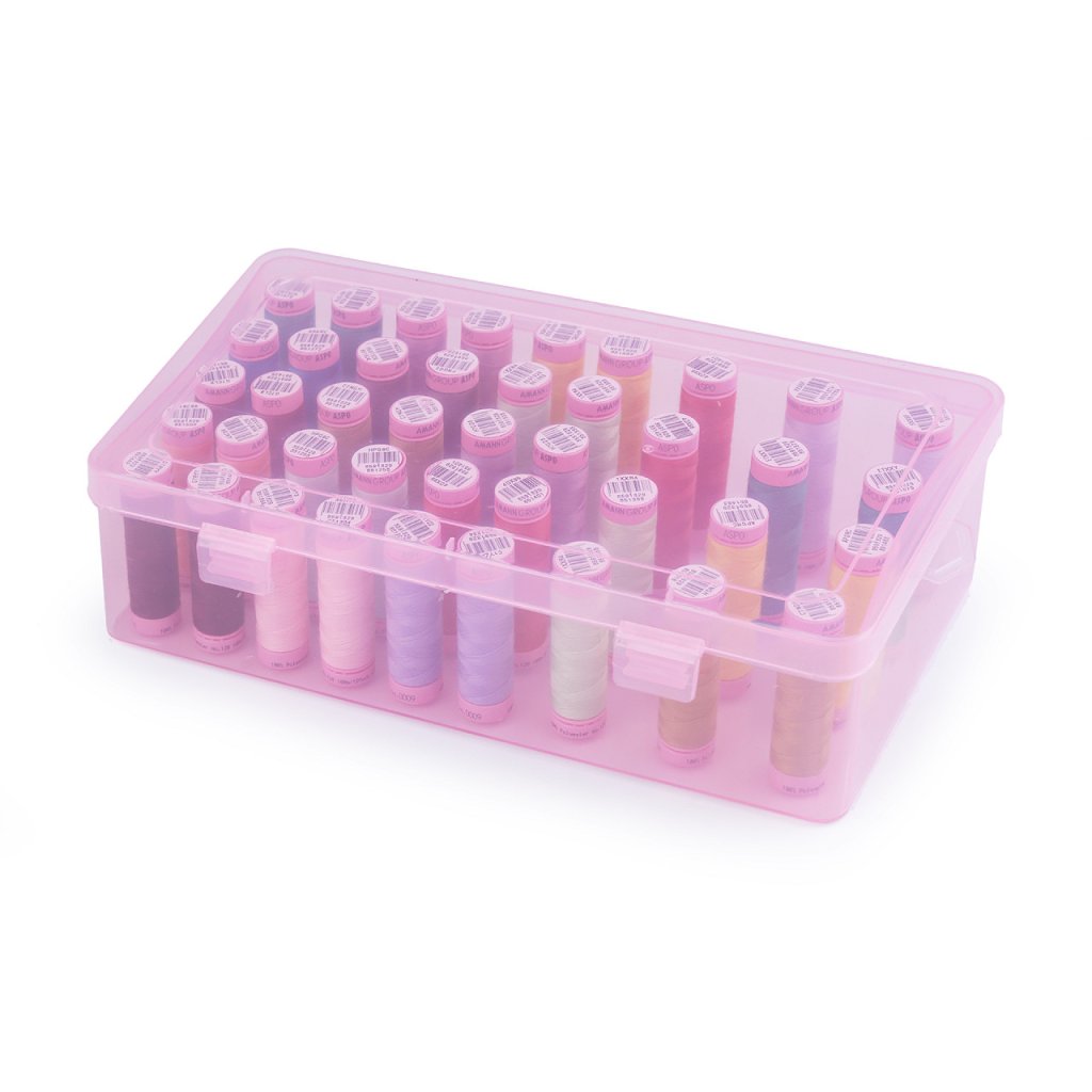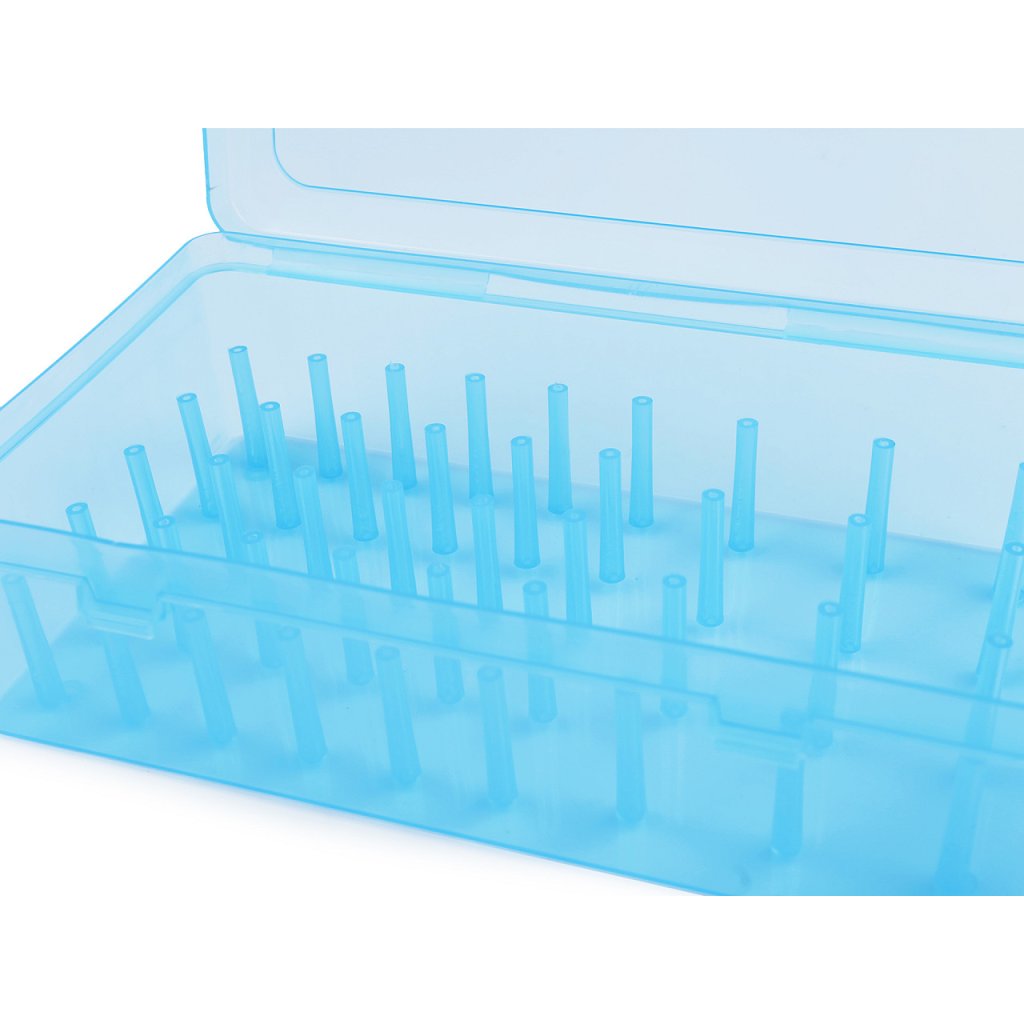 Box s pákovým uzavíráním využijete na uskladnění 42 ks špulek s nitěmi. Díky kolíkům, které jsou na dně boxu, zůstanou nitě na svém místě. 12 kolíků má mezi sebou větší mezery, jsou vhodné na nitě s větším návinem.