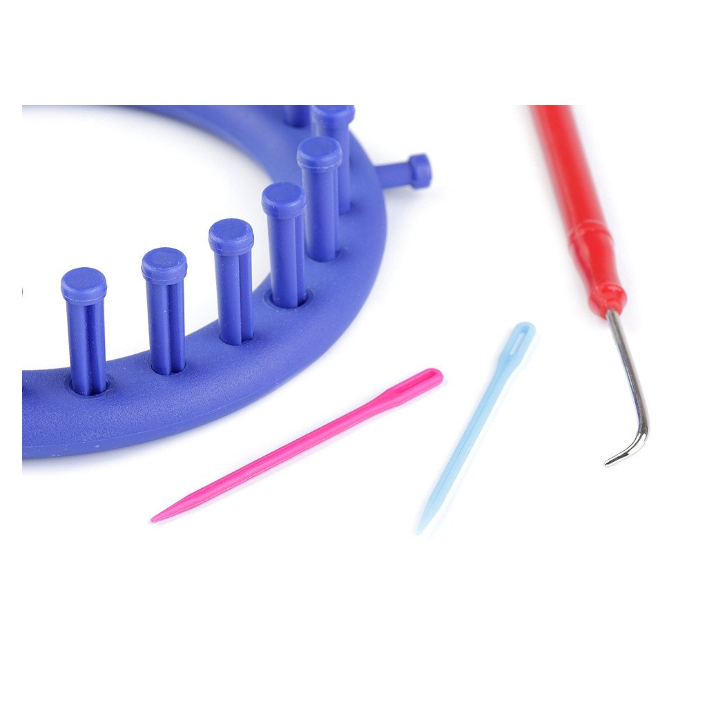 Balení obsahuje kovový háček pro snadné snímání ok a 2 plastové jehly k zapošití příze. Součástí balení je i podrobný návod v češtině, slovenštině a angličtině. Na kruhu je 24 hrotů + 1 pomocný hrot je z boku.
